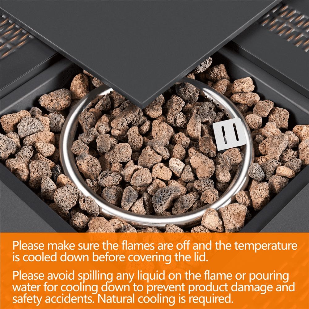 This multi-functional fire pit table is an excellent choice for outdoor heating all year round. Easily light up the sparkling flames with an electronic ignition switch and be surrounded with warmth and coziness in no time. The durable all-steel construction ensures long working life, providing you with many years of functions and pleasure. Practical and versatile as it is, it can not only serve as a fire pit table but be used as a dining table, coffee table or bar table with the lid covered, a perfect combination of summer table and winter pit. Bring a romantic atmosphere to your outdoor space with this stunning square fire table and enjoy quality time with your family and friends at all seasons.
