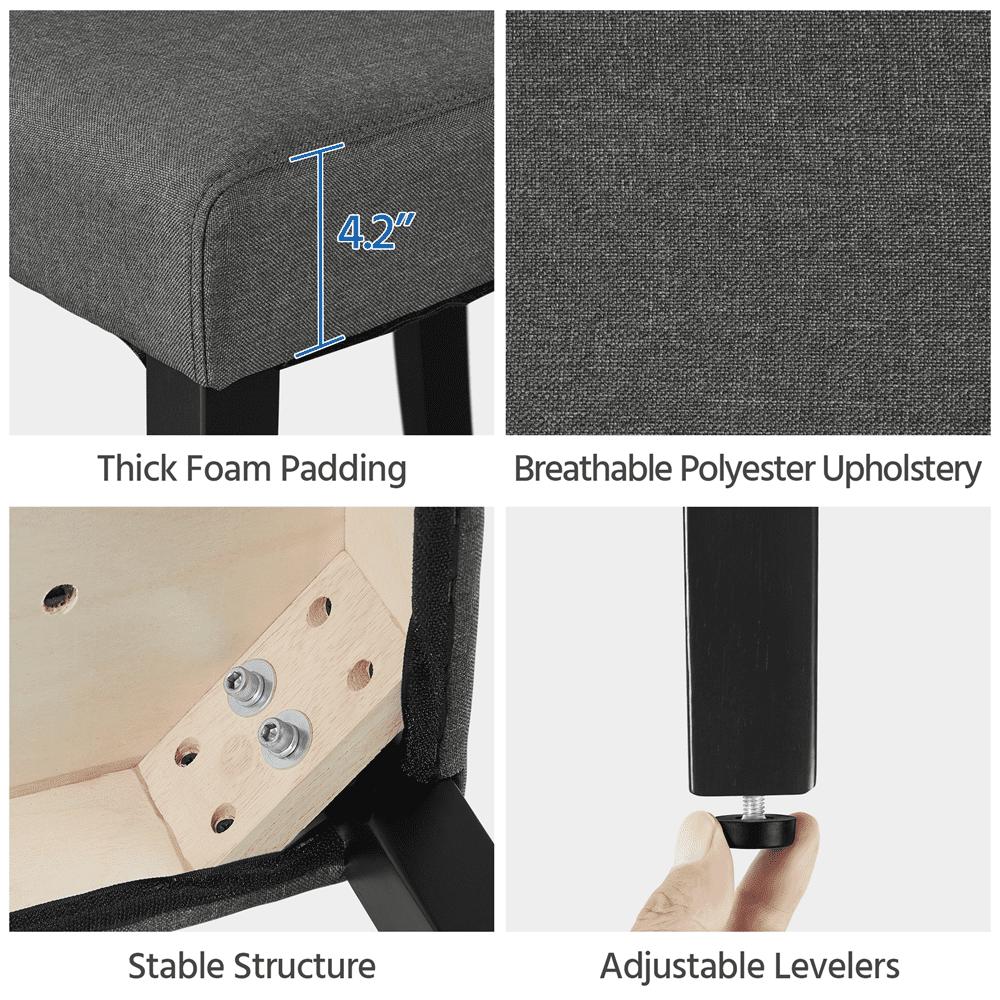 Looking for a comfortable and durable dining chair set These parson urban style fabric chairs are exactly what you want! The upholstered chair is made from solid wood, comfortable foam and durable polyester fabrics. The superior quality of the side chair serves well and provides you with a comfortable sitting experience, and the footpads will protect your beloved floor from occasionally scratching. Our classic dining chairs are strong and stable enough to hold up to 135kg/298lb (ea.). The stylish looking will go well with the other furniture in your house!