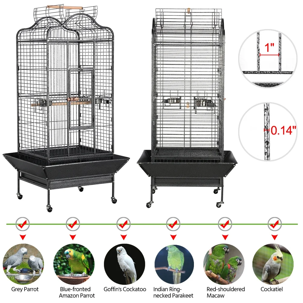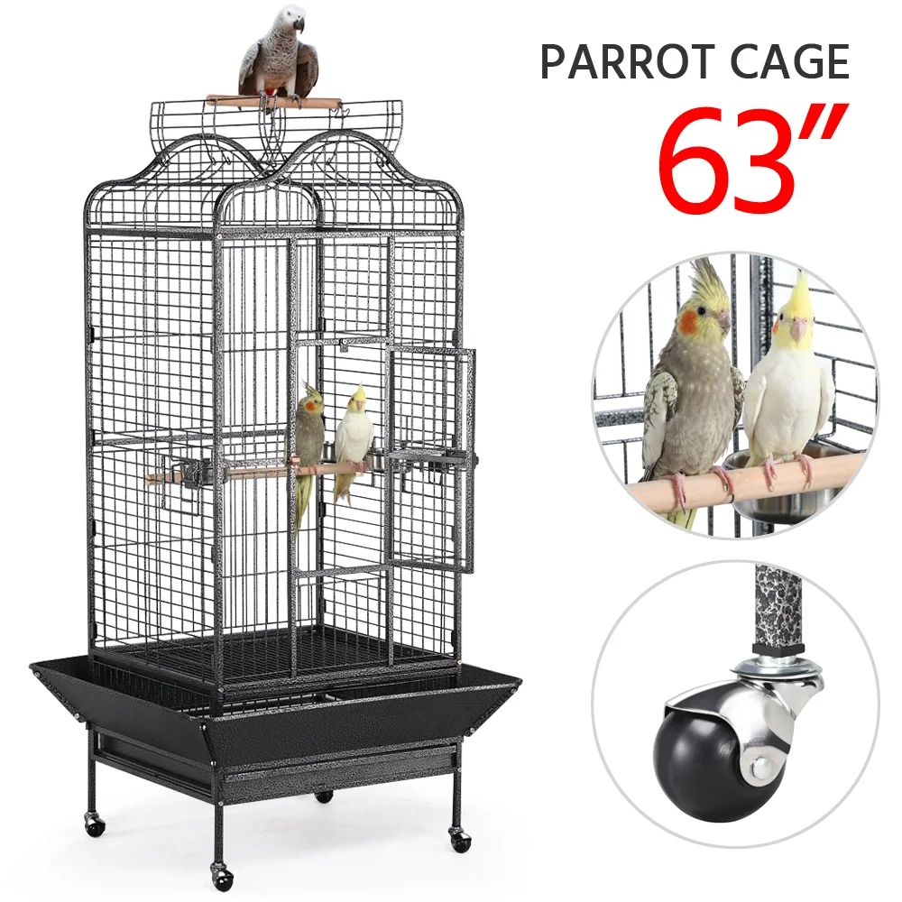 SmileMart 63″ Large Parrot Cage with Open Playtop Metal Rolling Bird Cage for African Grey Parakeets Cockatiels,Black: Extra large parrot cage: This W60.5xD56xH113cm/W24xD22xH44.5’’ deluxe bird cage with 2.5cm/1’’ bar spacing and thick wires is designed for accommodating several medium size birds or one large size bird like African Grey. The open top design provides a more convenient way for better interaction between you and your birdies. Ultra-strong construction: Our extra large bird cage is crafted of premium metal and finished with non-toxic hammered paint. Welded frame and excellent rust and water resistance make this parrot cage a durable and safe pet home with high quality. Safe & Secure: The front door is secured with button lock and feeder doors are locked by hooks, which can prevent your smart birdies from opening the doors and keep them safe in the cage when you are not around. Also, the open roof can be closed firmly. Stainless steel feed bowls and wooden perches are safe and durable for your birds’ daily use. Convenient moving: Due to its extra large size, it may take a little effort to move this cage. However, our parrot cage that sits on four heavy duty rolling casters has perfectly solved this problem. Ball-shaped casters can roll in all directions smoothly. Easy cleaning: A slide-out tray covered with waterproof paint can be removed and cleaned with water, making cleaning a breeze. A grate between birds and the tray can avoid your pets walking directly on their droppings, which ensures both your pets’ hygiene and the tidiness of the cage. Easy assembly: Simple assembly is required to set up this bird cage. The cage comes with all necessary hardware, detailed instructions and an Allen key for easy and quick assembly. Wide application: This high quality parrot cage is suitable for both home and outdoor use. Large space and simple yet thoughtful design make it a perfect choice for pet stores. *Specifications: Material: steel, iron, stainless steel, PP plastic, wood Overall dimension (with roof opened): 81 x 77 x 160 cm/ 32 x 30.5 x 63’’ (WxDxH) Overall dimension (with roof closed): 81 x 77 x 154 cm/ 32 x 30.5 x 61’’ (WxDxH) Cage size: 60.5 x 56 x 113 cm/ 24 x 22 x 44.5’’ (WxDxH) Front door size: 46.5 x 23 cm / 18.3 x 9’’ (LxW) Feeder door size: 15 x 12 cm / 5.9 x 4.7’’ (LxW) Top opening size: 31 x 52 cm/ 12.2 x 20.5’’ (WxL) Feeder size: 11 x 4.5 cm/ 4.3 x 1.8’’ (Dia.xD) Bar spacing: 2.5 cm/ 1’’ Minimum wire diameter: 3.5mm/ 0.14’’ G.W.: 25.1 kg / 55.2 lb Color: hammered black Free accessory: 3 feeders; 2 perches NOTE: 1. Please notice that the color of this bird cage is not pure black. It is in hammered black. 2. Please allow ±0.2”/0.3cm errors due to manual measurements.