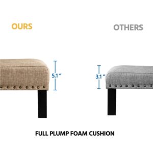 The fabric dining chair is constructed of strong wood frame with high quality rubber wood legs, wear-resistant cloth and elastic soft foam. Each chair is capable of holding up 125 kg/275.6 lb. The seat cushion is made of good breathable burlap fabric and high-density foam for better sitting experience.Our dining chairs are featured with simple style, soft fabric and copper-colored nailhead perfectly complete and bright up your dining room. The front legs are designed with adjustable feet caps to keep the chairs height balance. Four protective pads on the feet can keep your floor away from scratches.Sold in a set of 6 chairs. This set of dining chairs is classic designing and elaborately manufactured with good-quality materials. Perfect addition to the dining room, kitchen, living room, cafés and hotels
