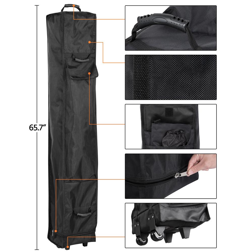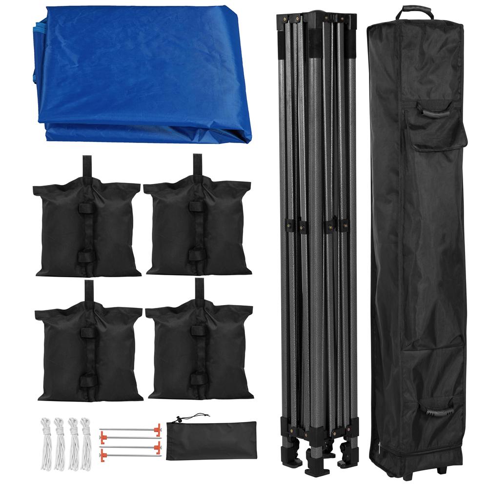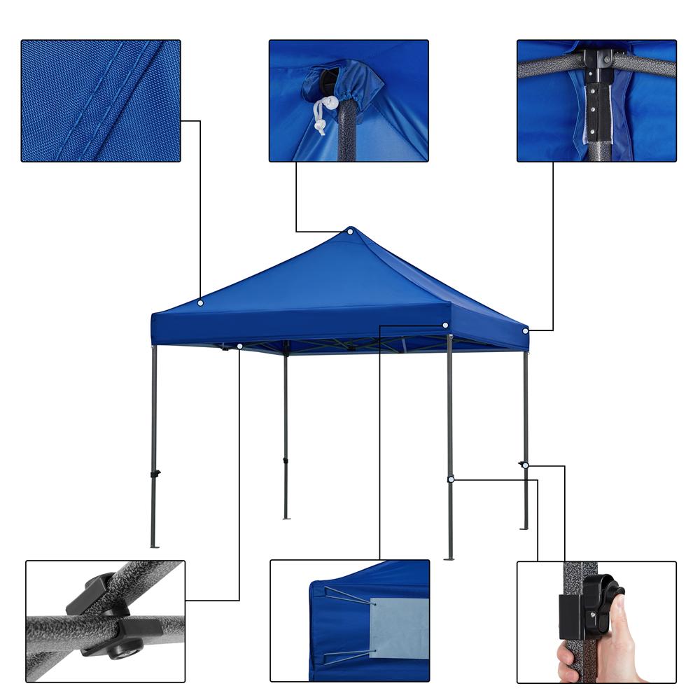This 10ft x 10ft commercial canopy is constructed of the 500D oxford cloth, PU coating, and a metal frame. These selected materials are durable, waterproof, UPF50+ ultraviolet-proof. The canopy will give you a shady and cool shelter, on sunny or rainy days. This heavy-duty canopy is height adjustable for different needs. There are three holes for height adjustment on each tubular column. The thoughtful details of the pop-up gazebo make it very convenient to set up and disassemble. Also, a wheeled carry bag is provided for easy storage and portability. The folding pop up tent is perfect for outdoor sports, festival events, flea markets, parties, etc. The instant pop-up gazebo comes with 4 sandbags, 4 ropes, 4 stakes and other necessary fittings. The sandbags are attached to the steel pipes by hook and loop fasteners.
