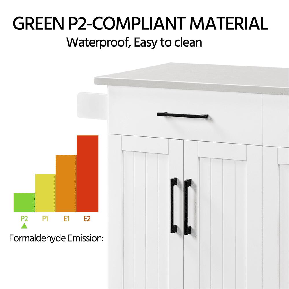Still getting trouble organizing your kitchen Functional storage solutions like a rolling kitchen island can help you expand your kitchen and store your cooking essentials without the clutter.Crafted with CARB P2-compliant MDF and high-quality particle board, this rolling kitchen island boasts durability and a strong load capacity that can totally hold up to 135kg/298lb, the tabletop with stainless steel cover is also stain and water-resistant. Stands on five wheels (2 with locks), it sports super convenient and effortless maneuverability and can lock into place if needed. In addition to offering multiple spaces for storage and organization, the cart can also serve perfectly as a breakfast/cocktail bar when paired with counter-height stools. Best of all, the Nordic style and modern design of it also add a touch of elegance to your home.