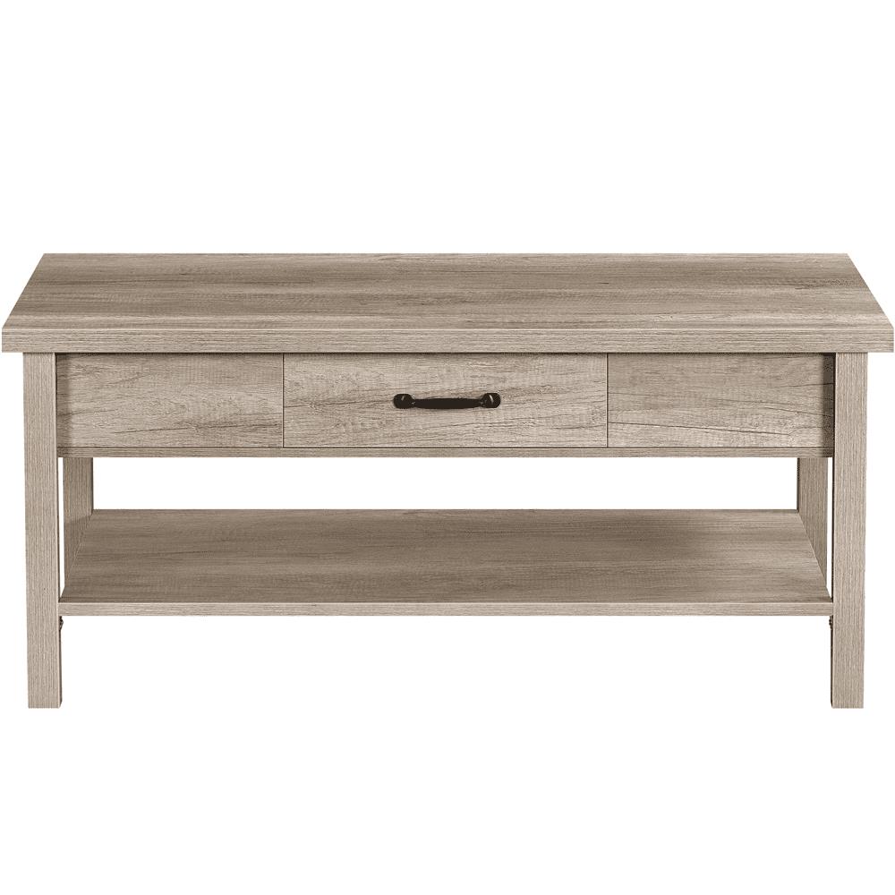 Doubles up on style and function in your living room with this smart lift-top coffee table! Featuring three roomy hidden storage compartments under the tabletop, this living room coffee table keeps your everyday items like books, laptop, remotes, game controllers handy yet out-of-sight. In addition to this, the height-adjustable tabletop can be lifted to a comfortable height (64.5 cm / 25.5 ) for working or dining while sitting on the sofa. The spacious bottom open shelf offers adequate displaying/storage space. The coffee table is constructed from CARB Phase 2-compliant MDF and water-resistant covering in distressed coloring. It is an aesthetically pleasing and practical choice for a vintage or rustic small apartment.