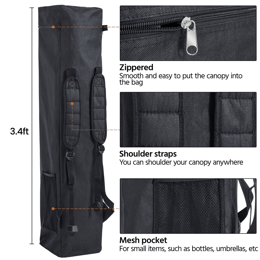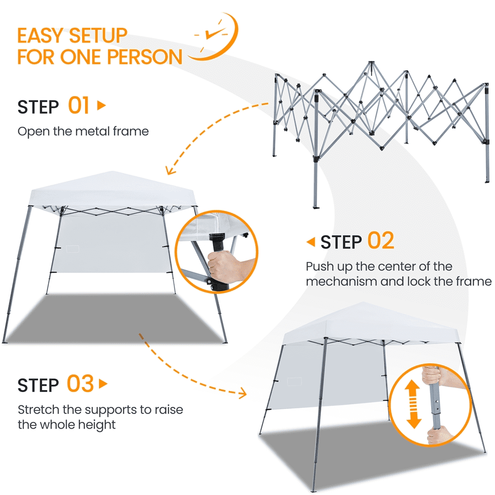 If you need a compact canopy for your family trip or BBQ in the backyard, try this decent pop-up canopy! Our canopy is made of silver-coated oxford cloth and plastic-sprayed iron, which has good stability and durability. Notably, we have all full accessories with this canopy, so you do not need to prepare other accessories. The backpack lets you take this canopy going outside conveniently. Also, the sidewall protects you from direct sunlight when you sit under the canopy. The pocket on the sidewall is a good spot for small items. The 4 legs are tilted yet stable when fully supported. The upper overall size of the canopy is 8ft L x 8ft W x 8.5ft H, and the lower overall size is 10ft L x 10ft W x 8.5ft H.This compact canopy is easy to set up due to its one-handed design. Just one person can push and set up the canopy in seconds, timing-saving and effortless. One of the sides has a sun-shading wall, which plays a good sun shade effect. This sidewall ensures that sunlight will not slant down to you when you sit under the canopy.With good value and thoughtful design, this waterproof canopy won’t let you down!