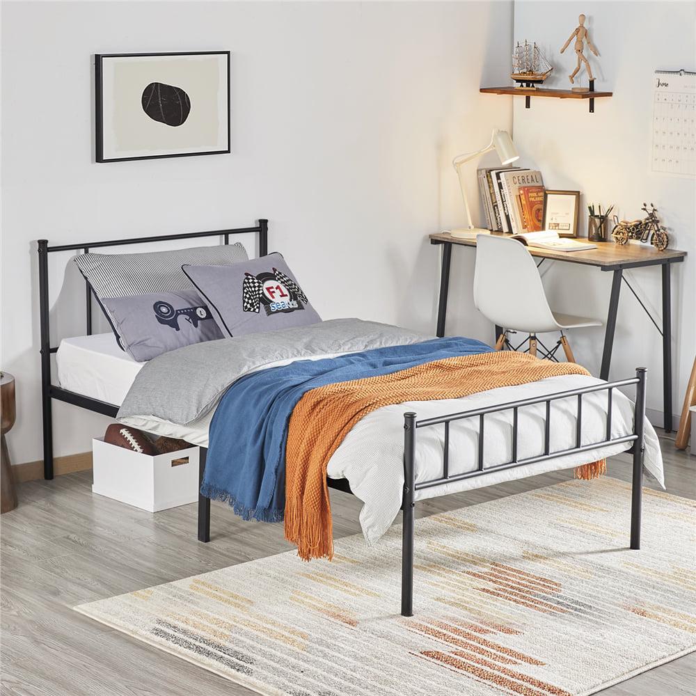 This bed base features a metal slat frame in black/white/silver finish. The headboard and footboard take spindle design, adding beautiful decorative details to the frame. The iron frame features premium powder coating for scratch- and rust-resistance. Make cleaning a breeze, wipe clean with damp cloth and a mild cleaner. Besides, the spacious storage space under the bed makes the room tidy and clean. Ideal for teenagers’ rooms, guest rooms, dormitories, apartments and all kinds of bedrooms.