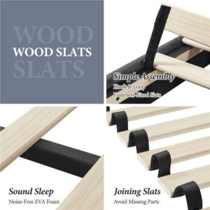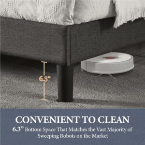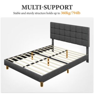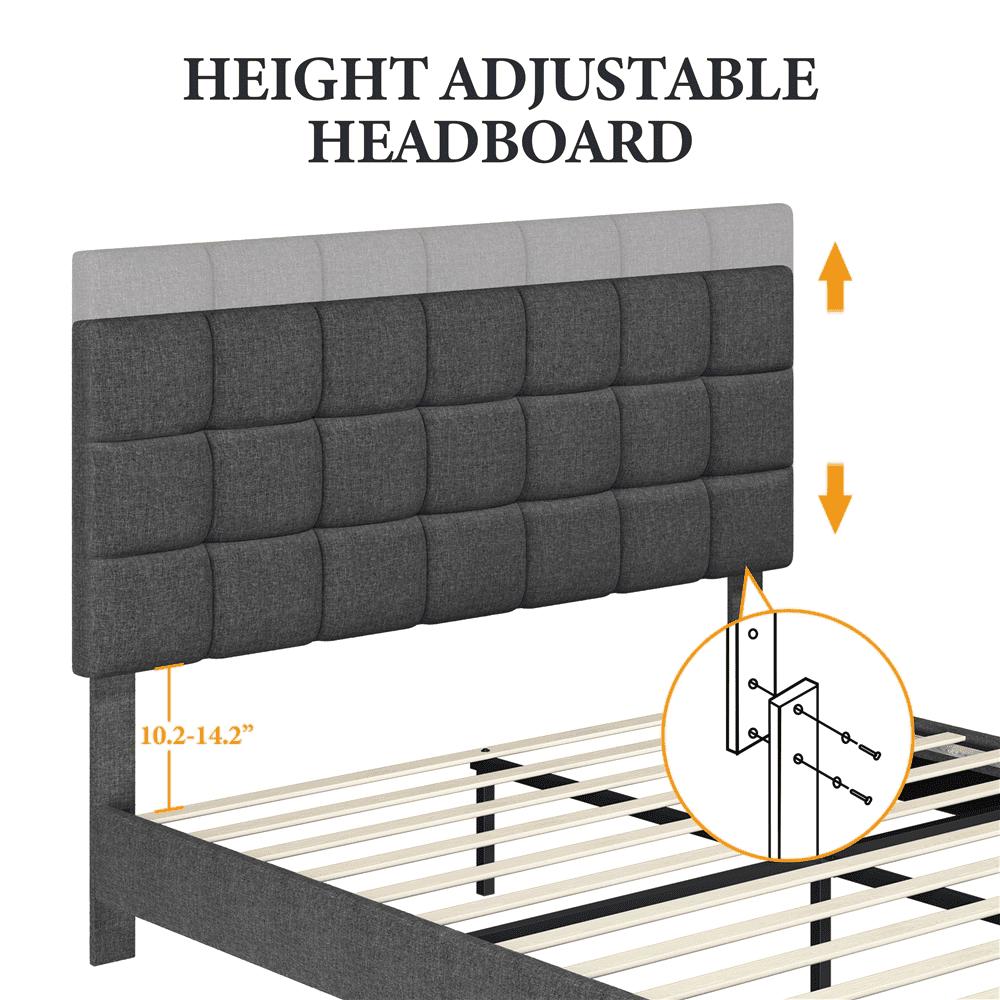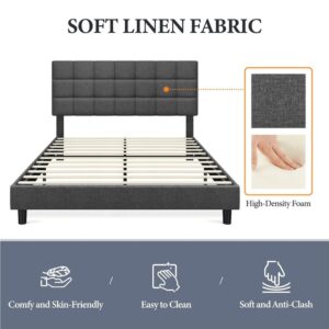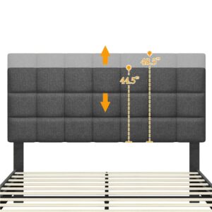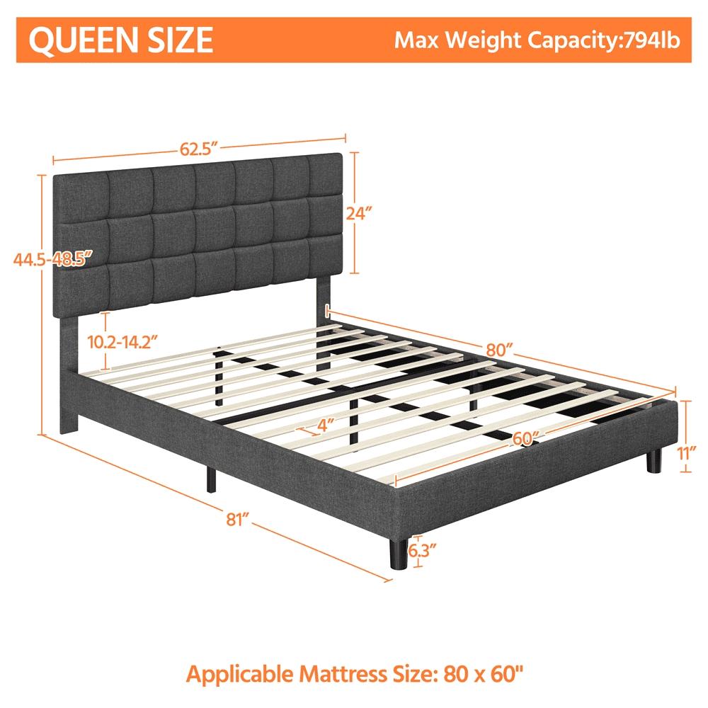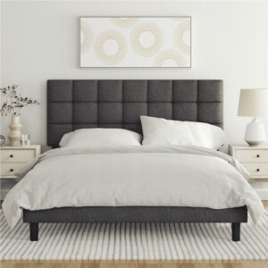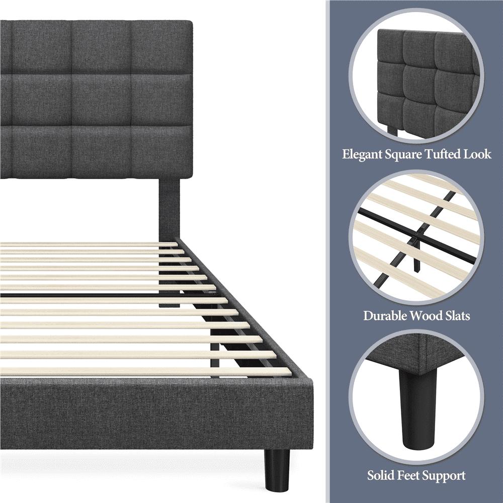 SmileMart Queen Size Modern Metal Bed Frame Platform with Wooden Slats Support & Square Tufted Fabric Upholstered Headboard, Dark Gray: