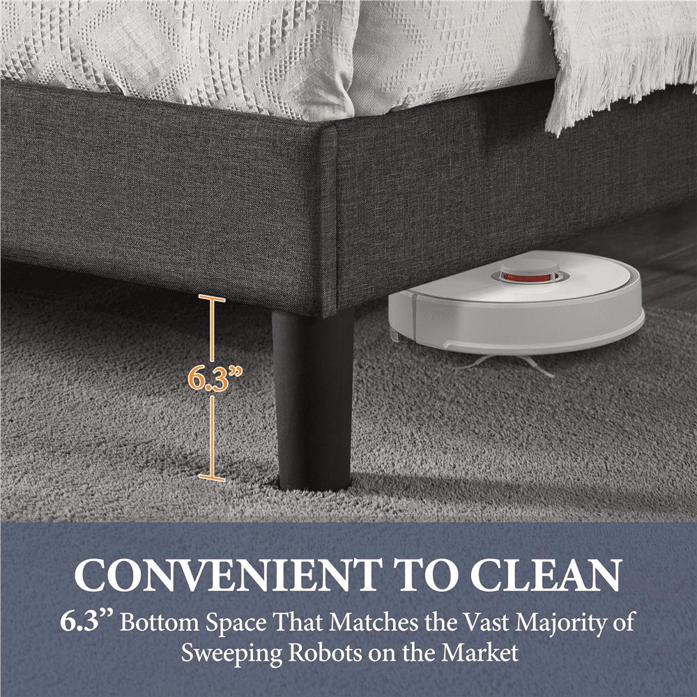 The metal platform bed with an upholstered headboard is made from a steel frame and features neutral fabric upholstery, adding a modern look to any of the bedrooms in the house. The foam-filled fabric headboard provides comfort for your head and body when you sit up in bed, while the wooden boards and central railing provide support for your mattress. This modern upholstered platform bed is the perfect centerpiece for your sleeping rooms, providing the perfect base for your favorite mattresses and bedding.