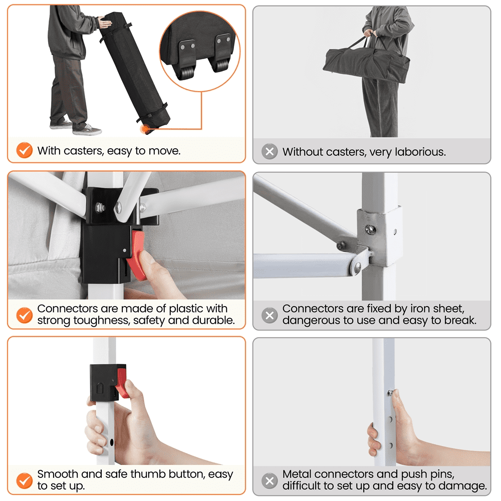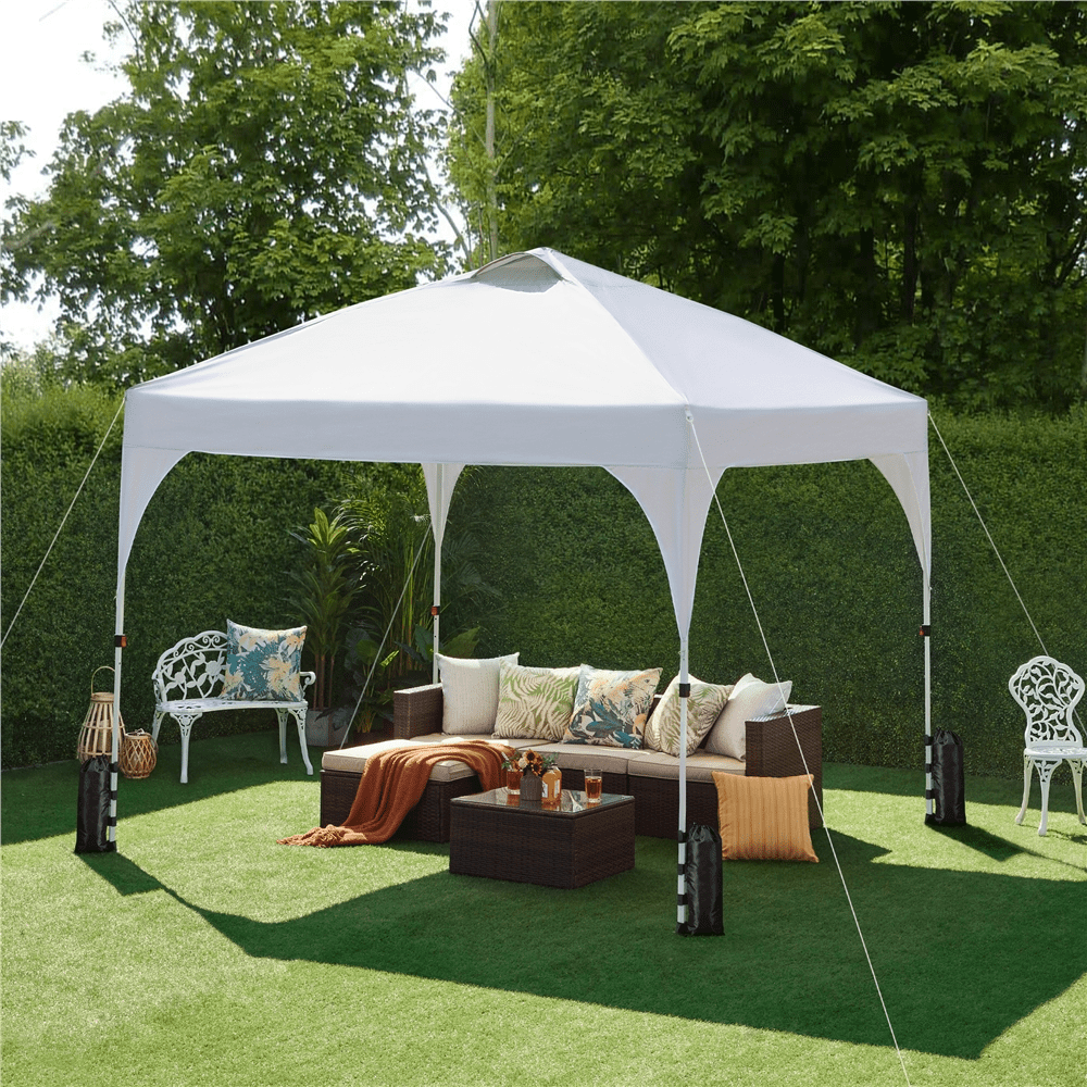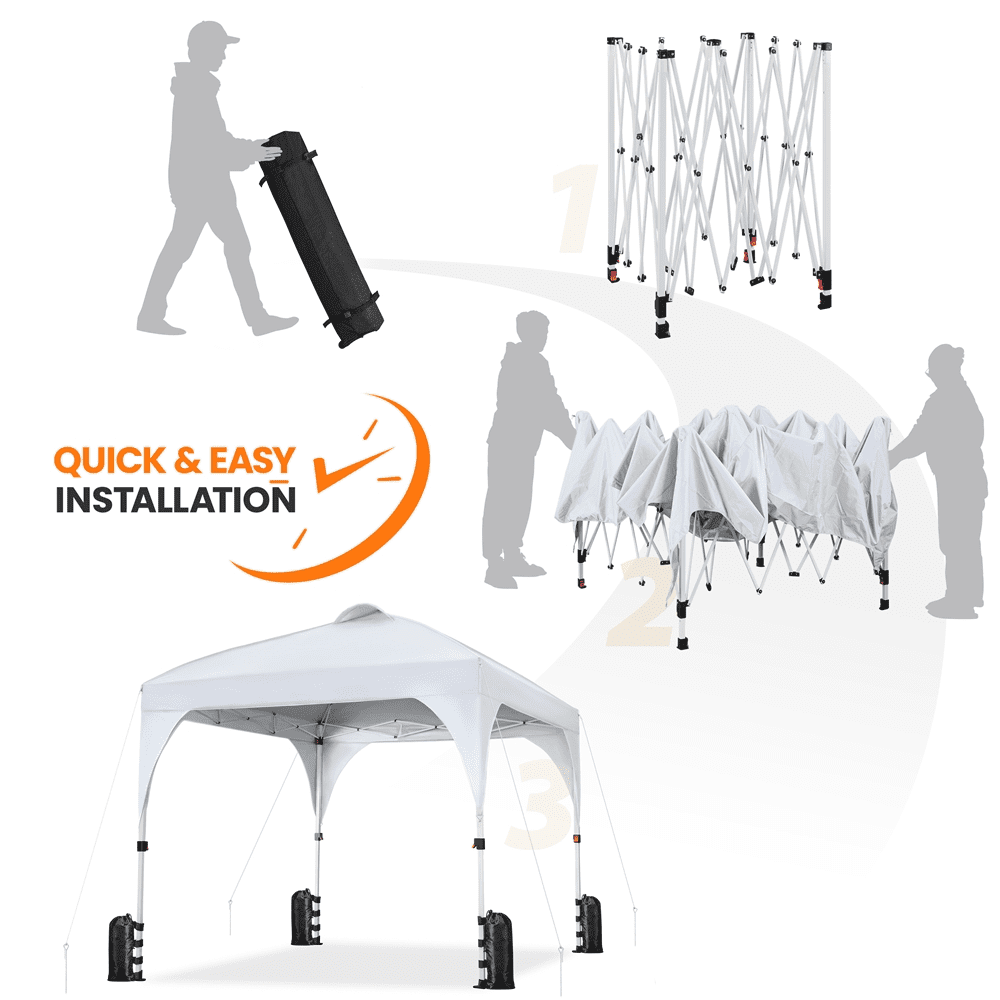 Ready to protect you from the direct sunlight and unpleasant heat, this 10ft × 10ft pop-up canopy tent is a perfect shelter for garage sales, backyard/beach parties, group tours, weekend markets, and commercial events. Made of UPF 30+ polyester oxford fabric with silver lining and powder-coated steel bracket, this canopy boasts high weather resistance and strength. The 17 LED lights on the roof is the highlight of this outdoor tent. The built-in LED lights are powered by a solar panel or a power bank (not included), and the brightness and on/off switch can be remotely controlled. Besides that, the adjustable tent height is also a plus. You can easily adjust the height from 8.3′ to 9′ in 4″ increments by the snap buttons on the legs. Best of all, this cost-effective canopy tent set comes with a rugged roller storage bag, 4 anchor ropes, 8 metal ground anchors, and 4 sandbags.