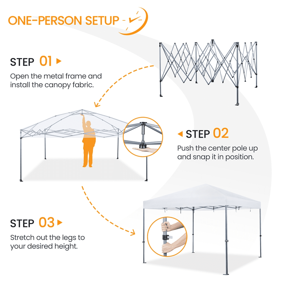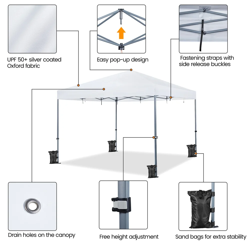 Block the unpleasant heat away with this 12ft x 12ft pop-up canopy! Constructed of UPF 50+ Oxford fabric with silver lining and powder-coated steel bracket, this canopy boasts high weather resistance and strength. The water-resistant and UPF 50+ canopy top is neatly stretched and supported by a powder-coated steel bracket. This pop-up canopy tent boasts high strength and durability and is built to withstand the elements.The one-handed locking mechanism allows for a simple setup that can be completed by one adult. The canopy can be fixed at any height from 215cm/7ft to 291cm/9.5ft freely. This versatile 12x12ft canopy can create a large cozy shady area for 12 to 18 people in your backyard/driveway or garage sales or other commercial events. Wheeled storage bag, 4 canopy cords, 8 L-shaped metal ground anchors, 4 sandbags are included. Thanks to the one-handed locking mechanism, the setup for this canopy tent can be effortlessly done by one adult. Just open the frame, install the canopy fabric, push up the center pole, stretch out the legs to your desired height and done! For ease of use, the provided wheeled storage bag with two rubber handles and two snap buckle straps stores and protects the canopy just fine and also saves you much effort to carry it.