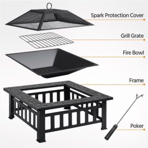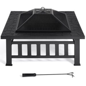 – SmileMart 34” Metal Square Fire Pit Stove Brazier for Graden Barbecue/ Heating/ Cooling Drinks with Cover & Poker, Black