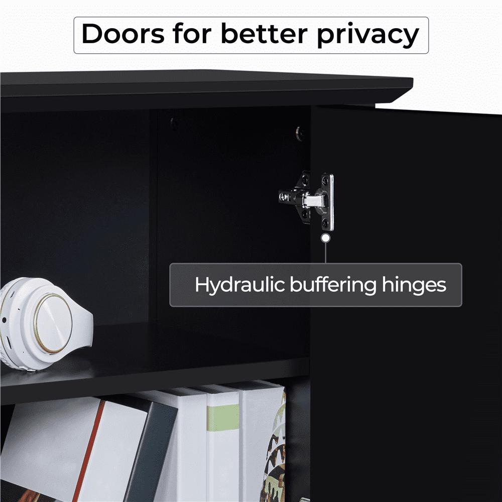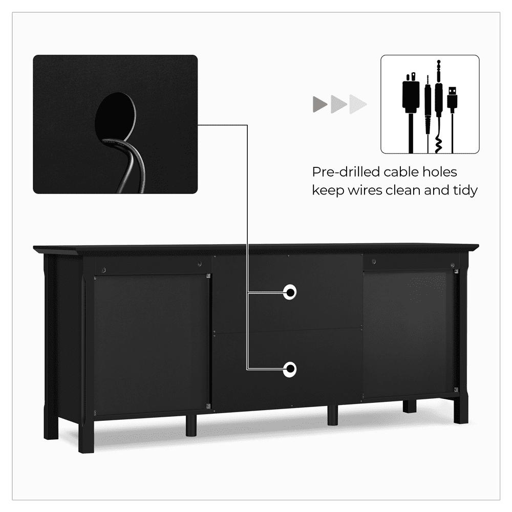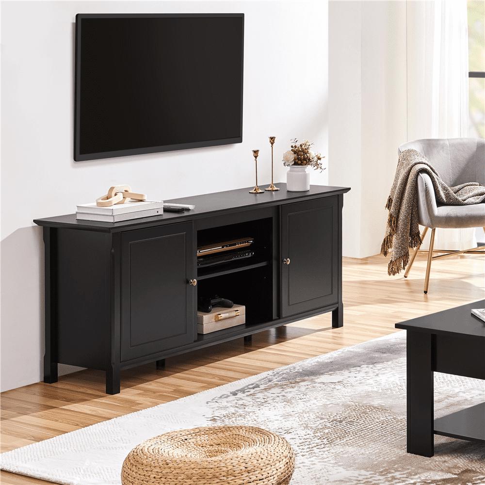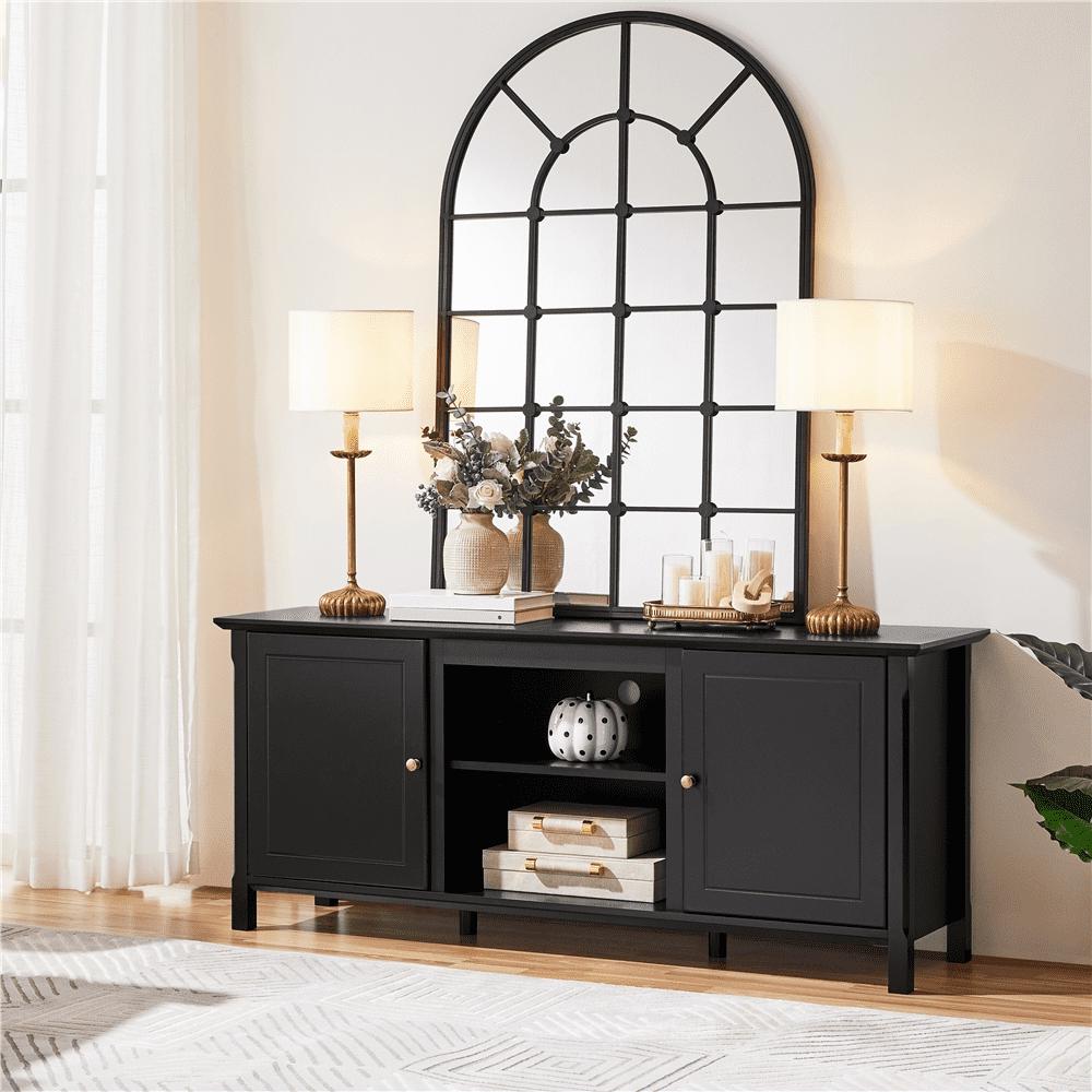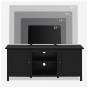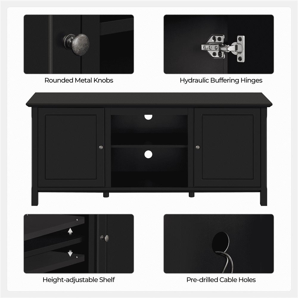 Seeing each piece of furniture as a member of a living space capable of conveying emotions to the host, we dedicate ourselves to long-lasting, functional and restful living belongings and introduce this latest addition to its furniture family. It s robust furniture that fits many different types of homes. This TV console series includes tall, regular and short versions to suit a variety of different spaces and floor plans. Our designers have made sure there s plenty of internal storage space for electronics, knick-knacks, blankets. Additionally, we leave a specific space for an 18″ electric fireplace so you can have a cozy private cinema or a playroom to pass those gloomy winter days with your dearest buddies and families. Never underestimate furnishings. They can redefine the function of a space or even define the relationship between you and the environment. Top-quality E1 compliant MDF serves as the main raw material in this TV console, which offers excellent protection against scratches and water. 4 solid legs and 2 extra central columns uniformly support the whole body of the TV console, while 2 fixed panels behind the doors bring further reinforcement. Its black surface, delicate bronze handles and square designs bring style and class to this TV console. All that s left is for you to see it in person yourself!