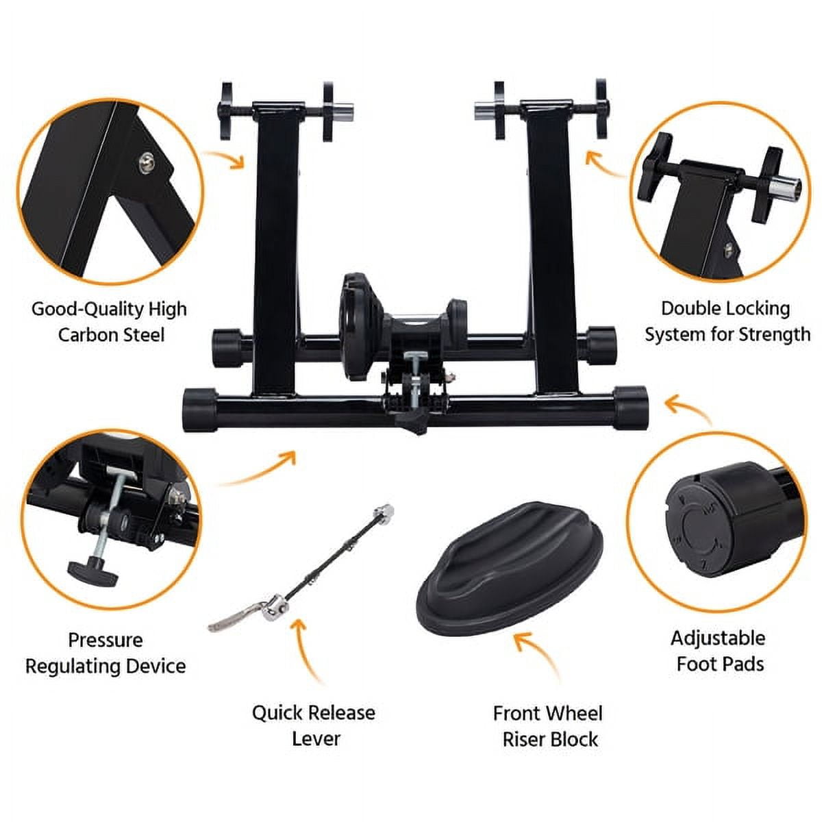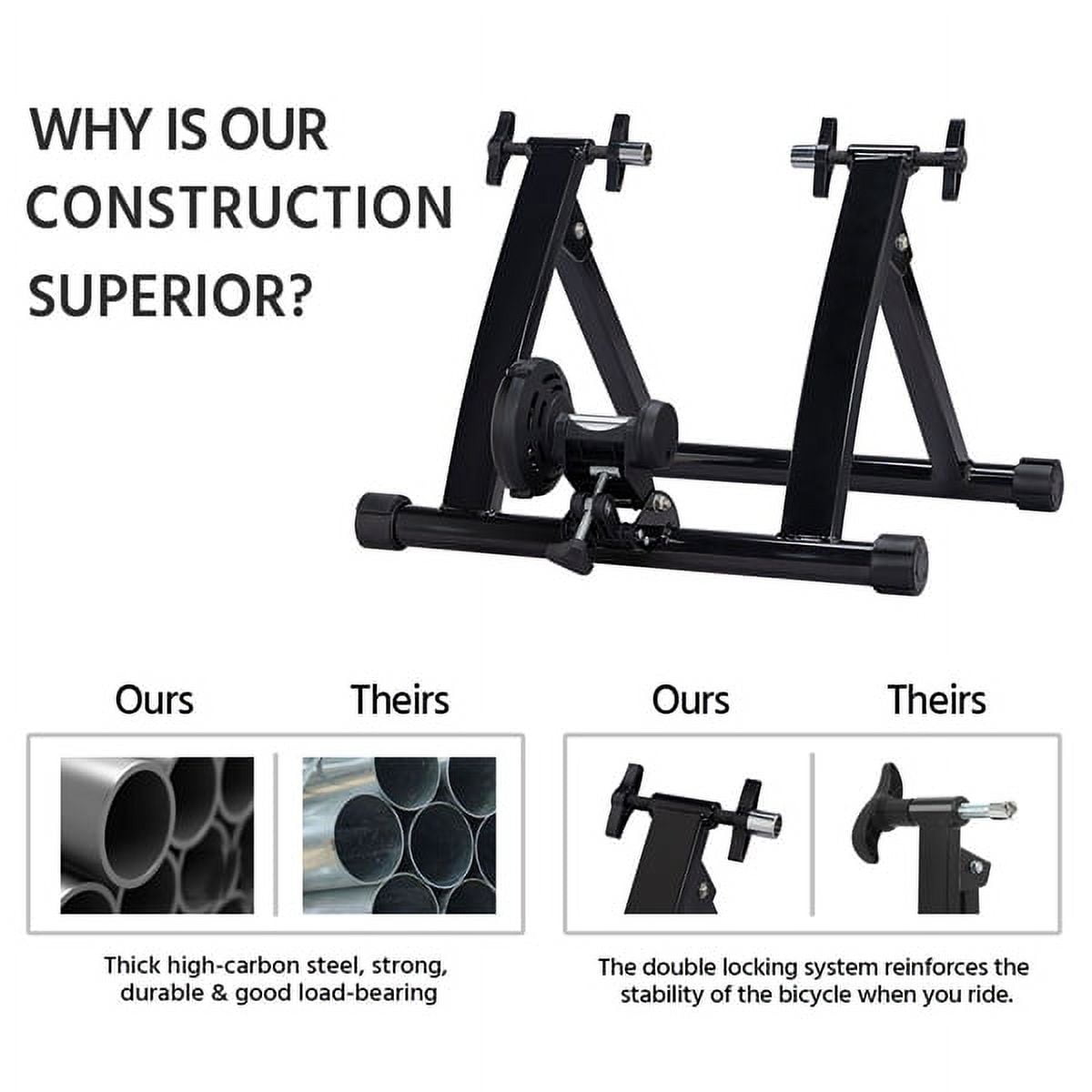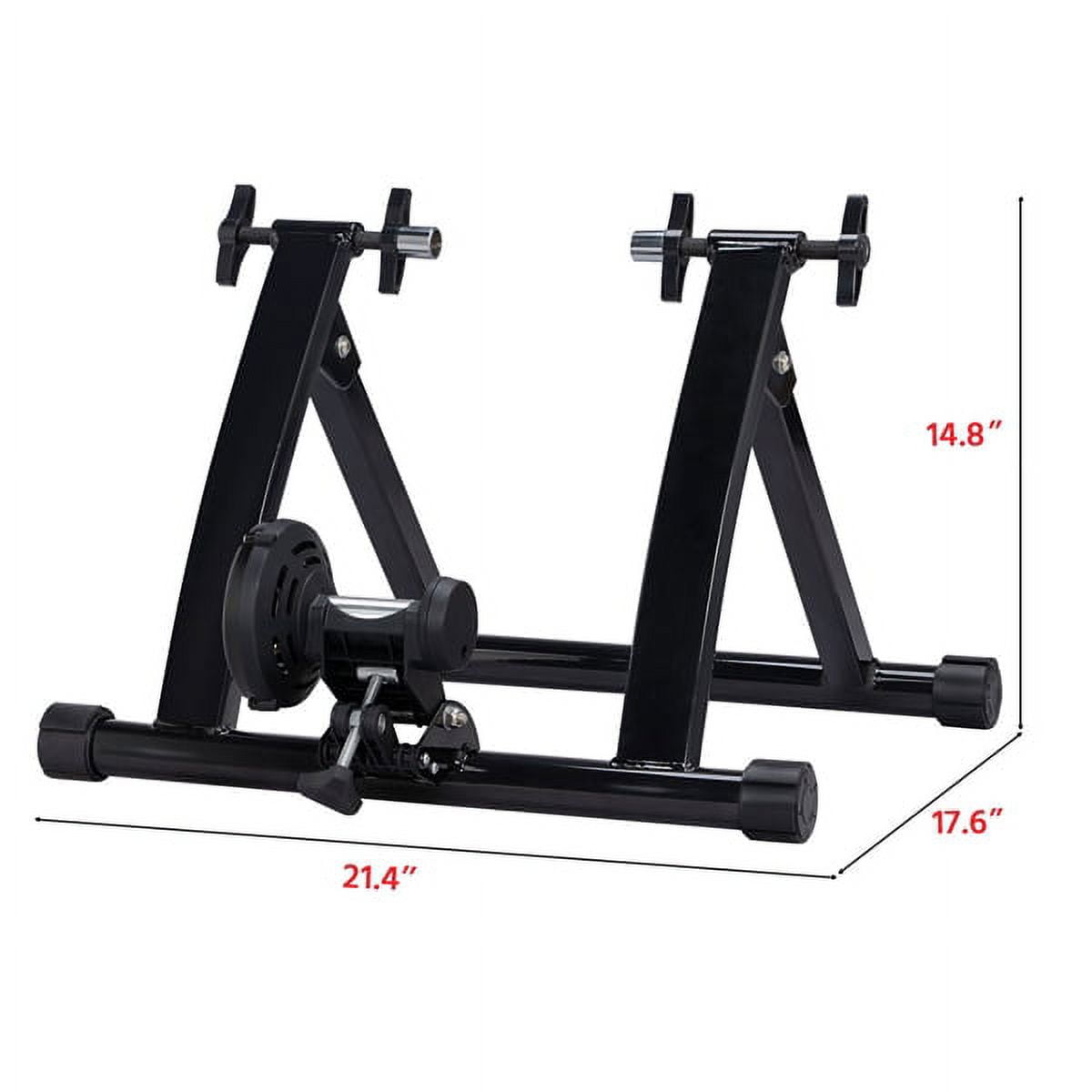 SmileMart Foldable Bike Trainer with 6 Speed Level: Materials: aluminum alloy, iron, plastic, magnet Unfolded overall dimension:21.5 x 23.8 x 14.8″(LxWxH) Folded overall dimension:21.5 x 7 x 17.3″(W x Thickness x H) Suitable for 26″ to 28″ and 700C wheels Max. Load Capacity: 265 lb G.W.:16 lb Color: black Packing List: 1 x Indoor Bike Trainer 1 x Instruction The noise is mainly related to the materials and tread of bike tires. The use of road bikes is highly suggested because the spinning sound will be louder if mountain bike is used. We also recommend using the bike trainer on a carpet to reduce noise.