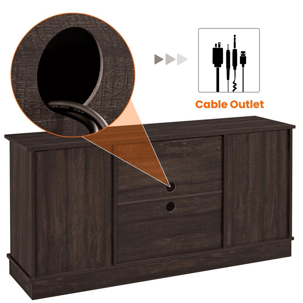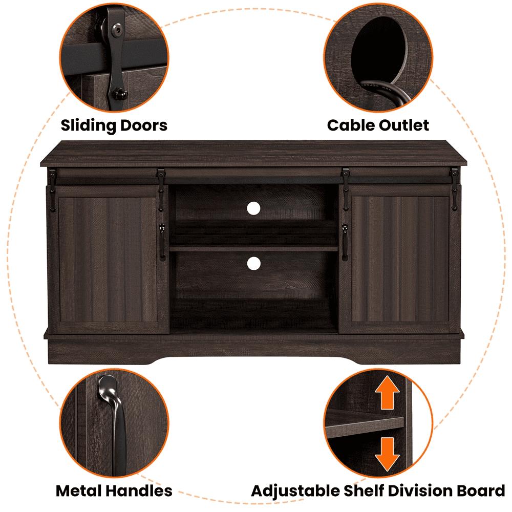 We are constantly vigilant for the latest furniture trends. Our industrial series reflects our approach to the surge in demand over the past few years for this industrial style. We see such a style not just as a trend that prevails but as the reveal of people s yearning for emotional care and nourishment just as what these rustic, unadorned pieces that convey. We hope that our products are not just some pieces of cold furnishings but of warmth that can complement the style of your home and help create your home into a restful habitat to nest. This industrial TV console comes in 2 colors, rustic wood in higher saturation and grey in lighter tone. Both are made of high quality and durable particle board that s been laminated. The sturdy iron frame is black matte coated and in the shape of a double X, not only reinforcing each side, but also counteracting the heaviness by adding airy expression. Our 55 industrial TV stand has 5 open compartments that come in 3 sizes. The 2 seamless large ones have pre-drilled cable management holes that can accommodate game consoles and the other 3 can house trinkets, souveneirs and more.