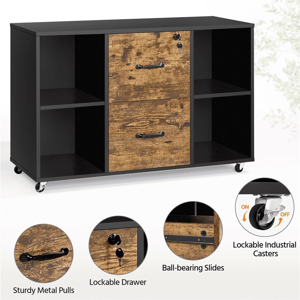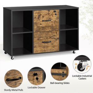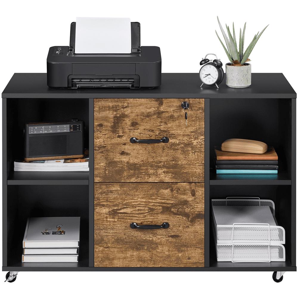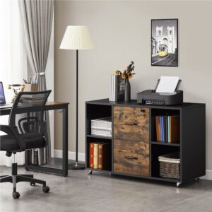 Smile Mart Rolling File Cabinet with 2 Drawers and Side Cubbies, Black/Rustic Brown: