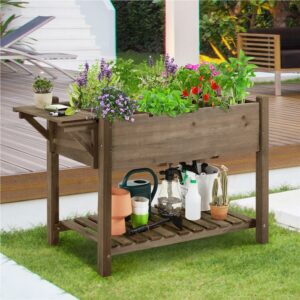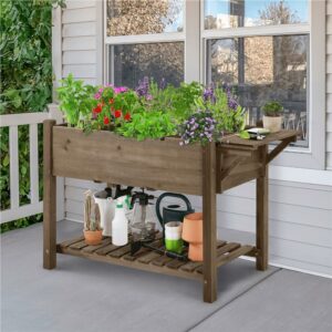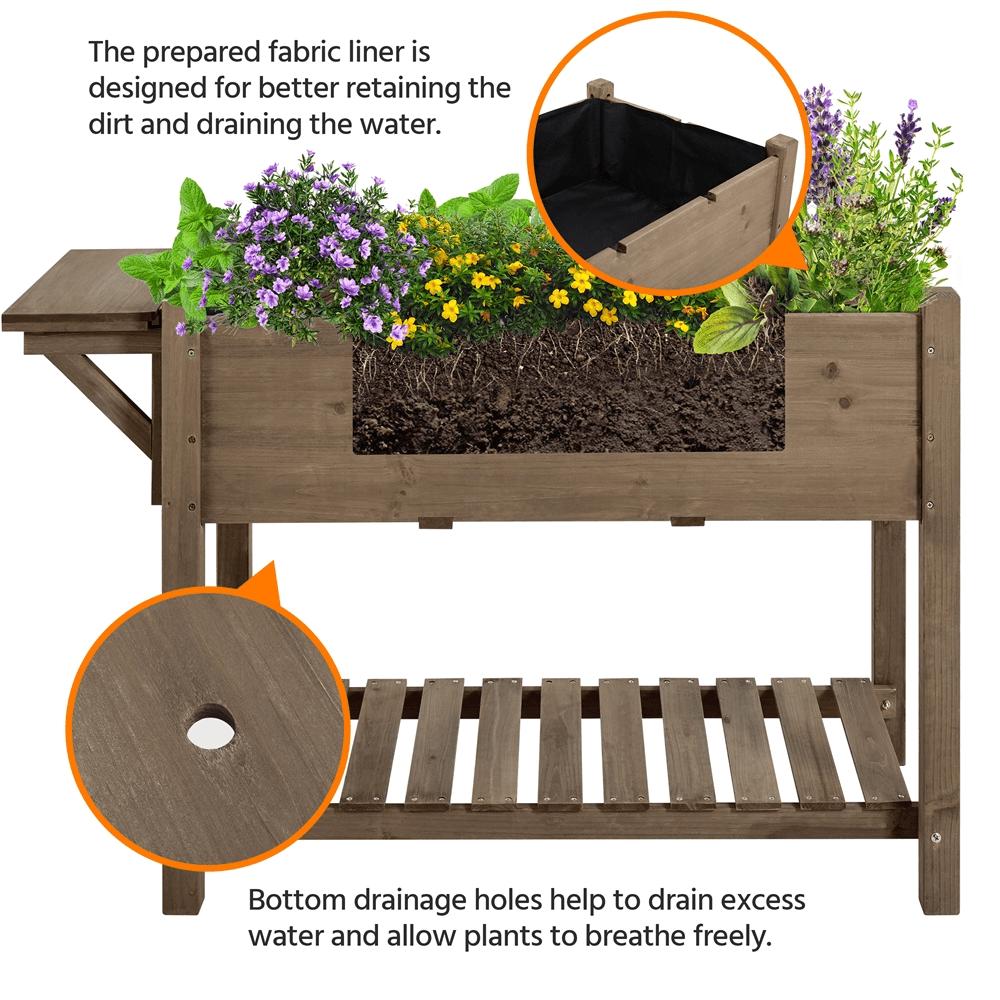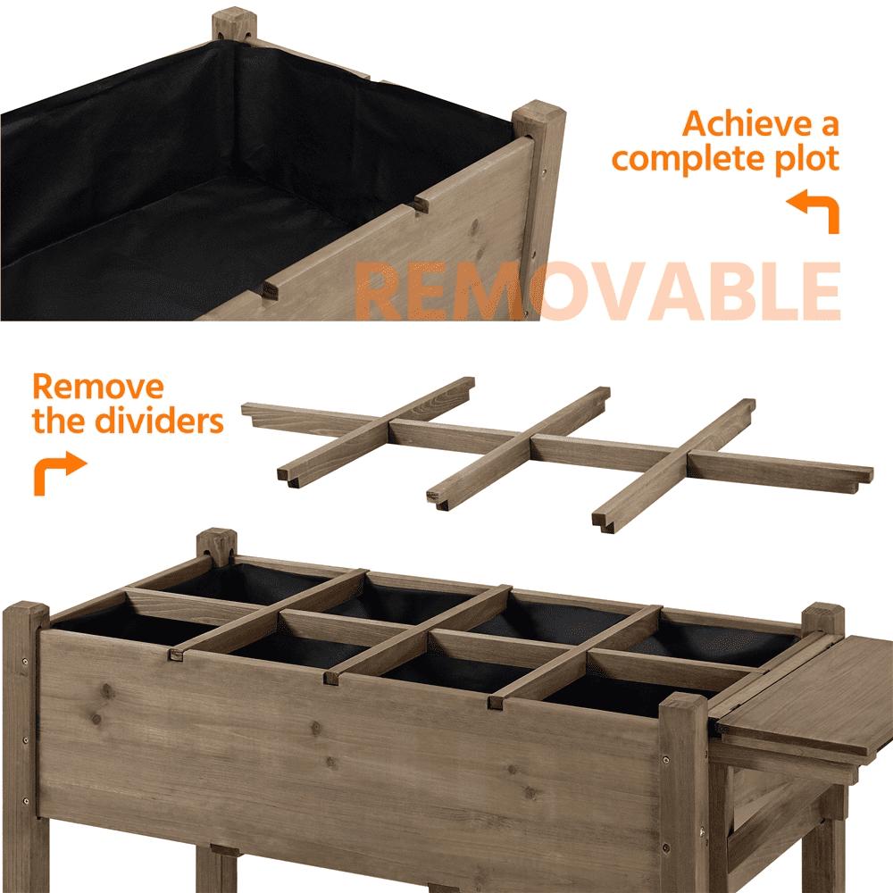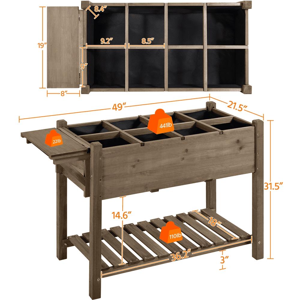 Start planting vegetables, herbs or flowers with this elevated garden bed, which also brightens up your garden. Made of 100% fir wood and built in a rectangular shape, this garden planter is sturdy and durable for years of use. The good natural resistance and fresh wooden smell are made for performance and aesthetic pleasure. This elevated garden bed is designed with 8 grow grids for planting different vegetables/herbs/flowers in the same planter box. An extended table ledge and bottom shelf provide ample storage to keep gardening accessories within reach. The extra fabric liner and drainage holes are designed to help plants grow quickly and healthily. Ideal for the yard, patio, balcony, deck, porch, apartment, etc.