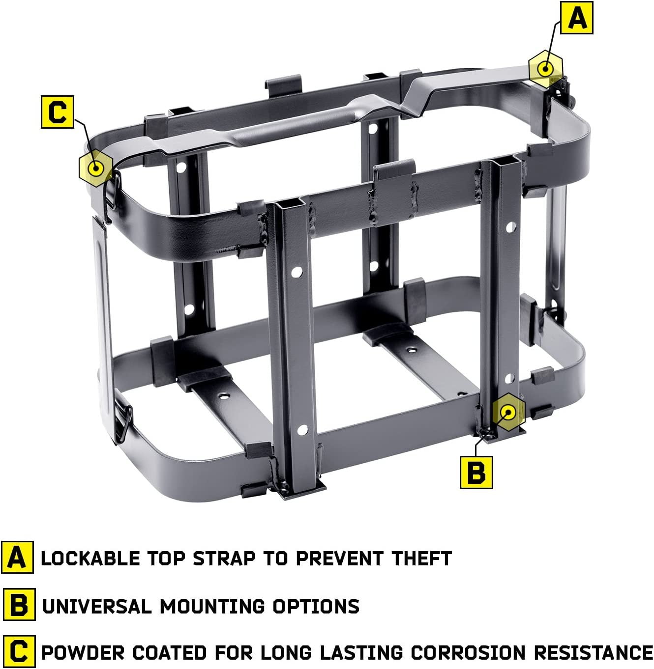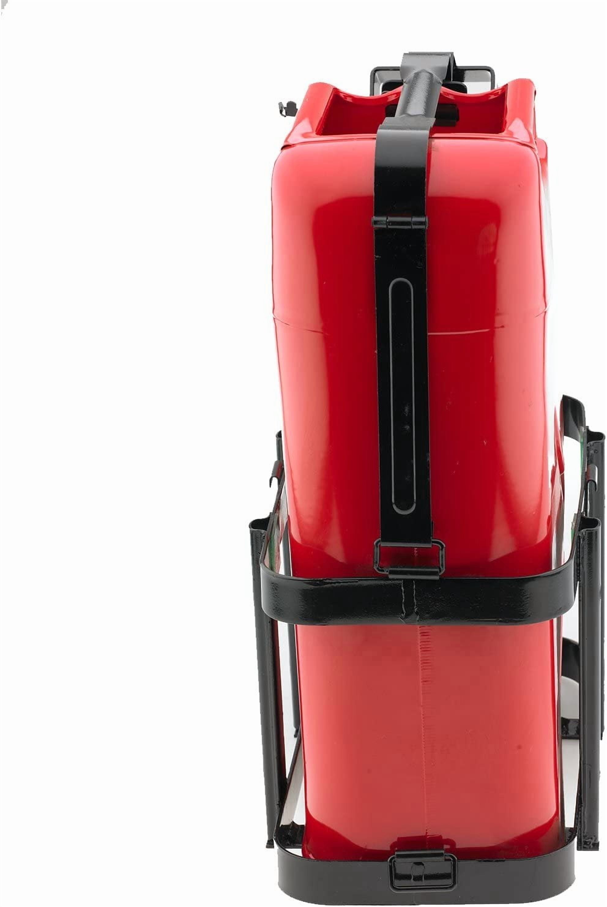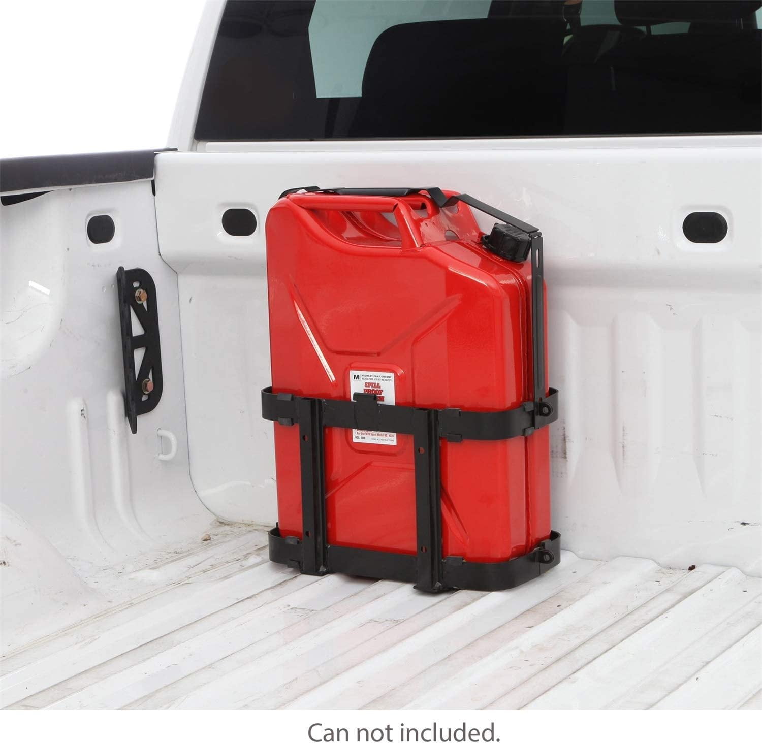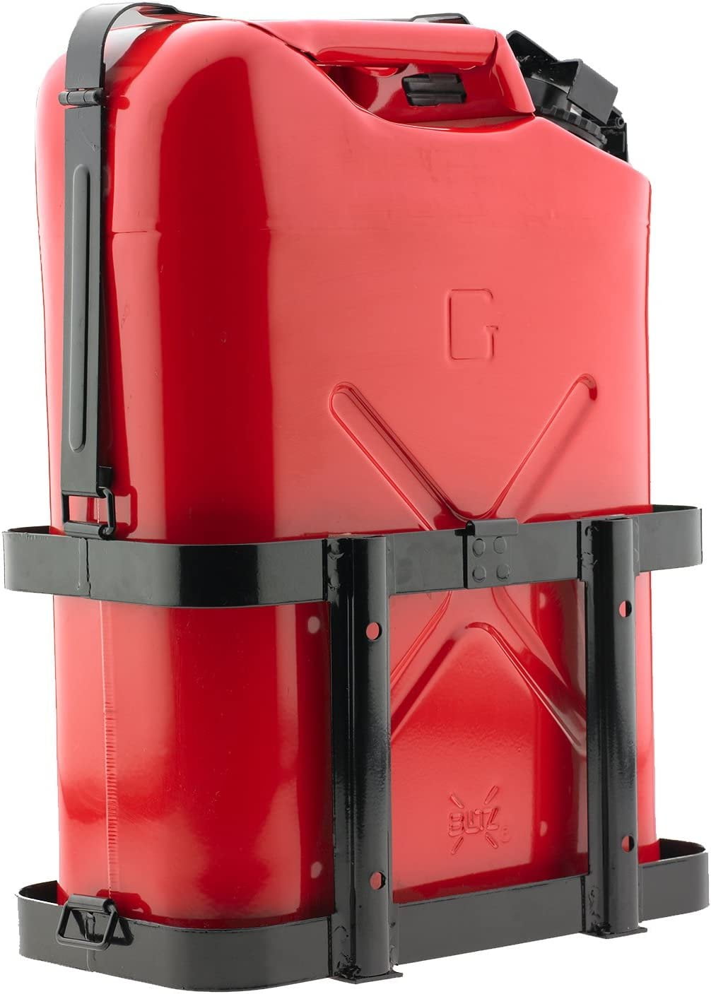 Holds 5 Gallon Steel Jerry Can Store extra gas, water, diesel, or other fluids for emergency or increase your range Lockable top strap to prevent theft Universal mounting options – product dimension – 14 x 7 x 18 1/2 inches Powder coated for long lasting corrosion resistance Full metal construction for rugged use and abuse
