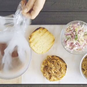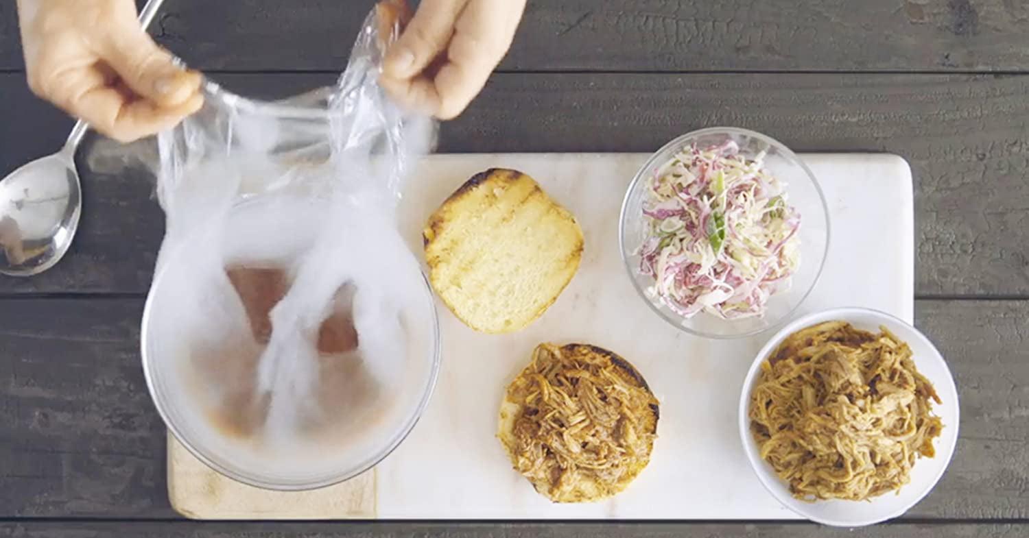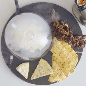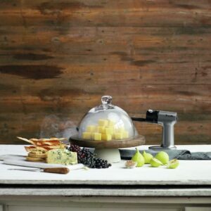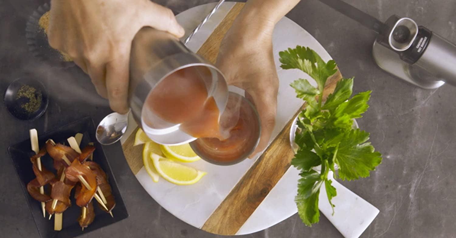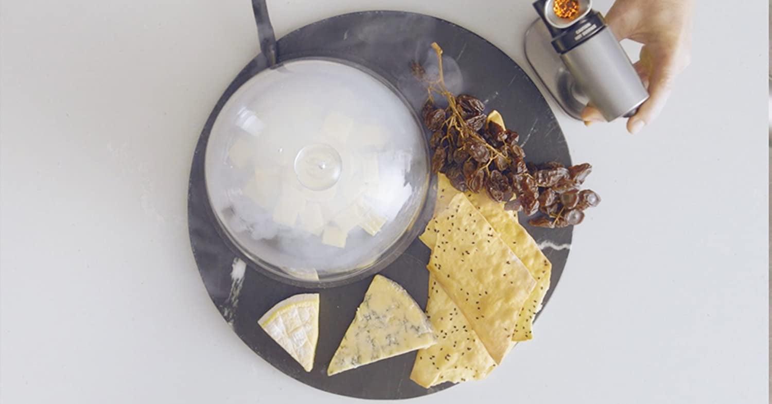 The food smoker for home chefs and mixologists adds big, smoky flavor and aroma to foods and cocktails in just 5 minutes without adding heat. A smaller, more versatile alternative to traditional smoker accessories, it requires no presoaking wood chips or cooking for hours for that rich smoky flavor. It does not cook or preserve food, or change textures or temperatures. Cold smoking with The Smoking Gun has never been easier. Gently infuse measured amounts of natural cool smoke to prepared and delicate foods to enhance flavor. Lightweight (.75-pounds) and low noise (58 dB) for comfortable single-hand use. Dual-flow air speeds (7.1 and 11.1 m/s) to control smoke intensity. Detachable .75-inch 18/8 stainless steel burn chamber for easier loading and cleaning. Smoke meat, poultry, fish in a flash after plating. Elevate bartender recipes for exciting smoked drinks, like Smoky Marini, Smoky Mary and Dragon’s Breath. This battery operated portable smoker works indoors and out to infuse smoky flavors from wood smoking chips, teas and spices, hay, dried flowers and herbs. Creatively pair combustibles with foods, like cheese and smoky dill, butter with rosemary or thyme, smoke sauces, tomatoes for salads, chocolate, meringues and fruits. To use, simply fill burn chamber with combustibles, switch on and light with a match or lighter. The flexible extender hose applies smoke directly to plated food, inside resealable bags, or containers. The burn chamber contains any heat so only cool smoke is produced.