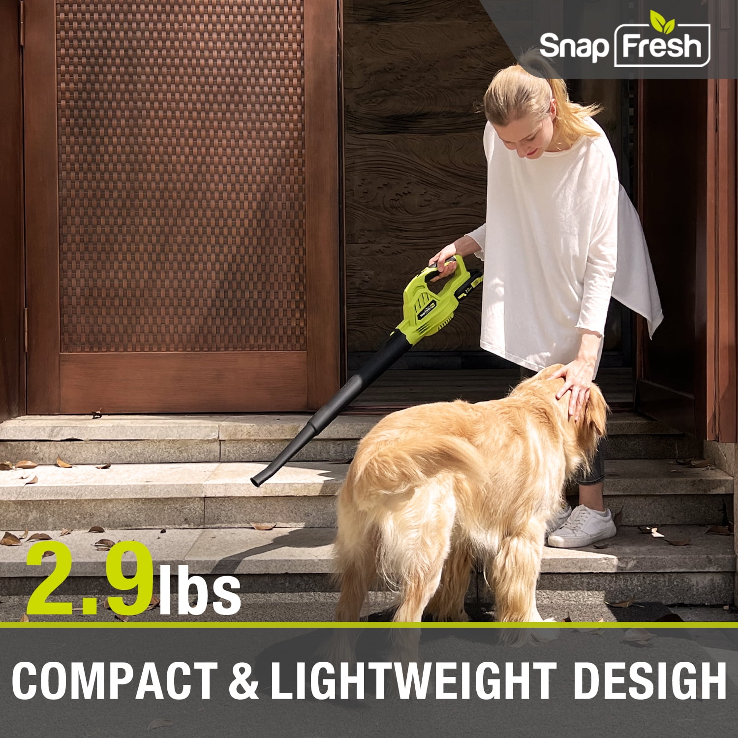 The SnapFresh 20V Cordless Leaf Blower, Accompany Your Work with Joy and Easiness. The SnapFresh electric cordless leaf blower features advanced turbine capacity and is equipped with a copper motor that can run up to 130MPH. It delivers a longer product life span while reducing energy consumption and providing exceptional performance. The built-in strong motor ensures you to adjust efficiently between two levels of speed and provides you with strong wind for duties on the driveway, patio, porch, and deck and also for delicate works such as pet hair cleaning.