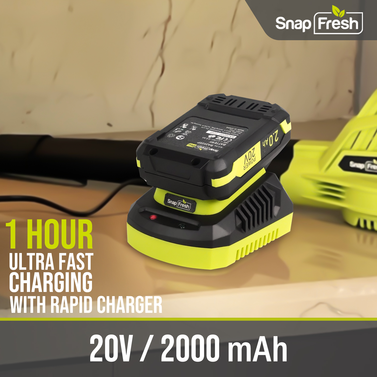 【Ergonomic Design & Portable】- SnapFresh Cordless Leaf Blower weighs only 2.7 lbs and is designed with no-slip hand-grip , making it effortless for handheld while working. The detachable and light design allows you to do one-hand operation with less fatigue and longer time, and also won’t be taking large place to store. 【Adjustable Tubes for Broad Usage】- With detachable blowing tubes, everyone is able to get a convenient experience from indoor works to outdoor works. SnapFresh Battery Powered Leaf Blower is ideal for heavy duties such as debris/sticky leaves from garages, yards and gardens or even for fast drying your car surface. [PS: If used for snow blowing, only suitable for light snow.] 【Rechargeable Battery and Maintenance】- The cordless leaf blower comes with a 20V 2.0Ah battery and a fast charger. A full charge only takes 1 hour, and it supports 25 minutes of efficient work in the low-speed mode and 20 minutes in the high-speed mode. Technical Specifications: Rated voltage: 20V Air volume: 130MPH Weight: 2.7 lbs Switch: 2 adjustable speeds Battery Capacity: 2.0Ah What’s Included: (1) 20V Cordless Leaf Blower Sweeper (1) 2.0 Ah Battery (1) Battery Fast Charger (1) Upper Tube (1)Lower Tube (1) Owner’s Manual