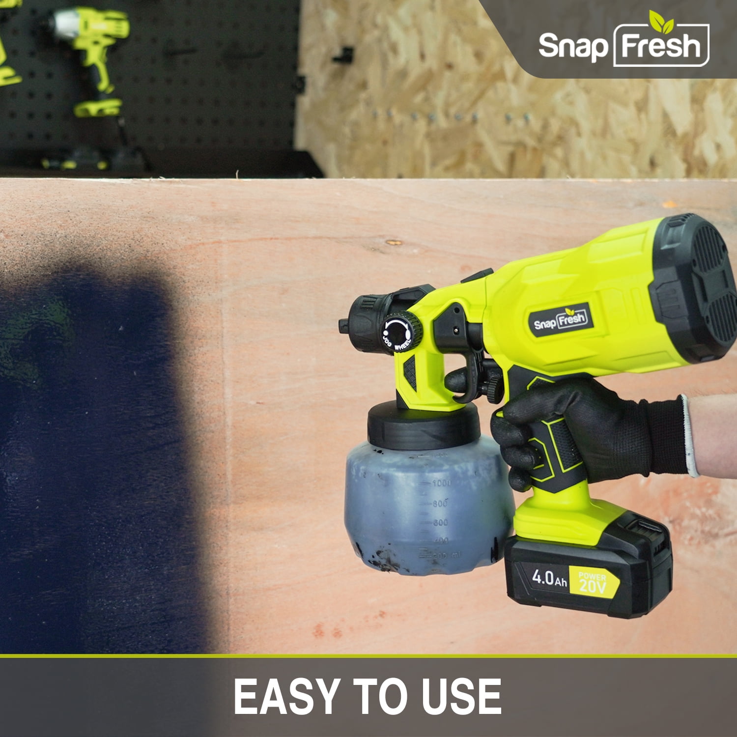 【3 Spray Patterns & 3 Size Nozzles】- Achieve vertical, horizontal, and circular spraying patterns with ease by adjusting the air cap ears to match the shape of your project. The SnapFresh spray gun is equipped with a preinstalled 1.8mm black nozzle and includes two additional nozzles (1.0mm and 2.5mm) in the box. 【Flow Rate Adjustment】- Take control of your spray by simply turning the flow control knob to adjust the flow rate. This allows you to achieve even and brush mark-free finishes on various surfaces, making it suitable for edges, corners, and broad interior areas of different work and DIY projects. 【Cordless Design & 4000mAh Battery】- Enjoy the convenience of outdoor operation without the limitations of cords with the SnapFresh Cordless Paint Sprayer. Its battery-operated design provides greater flexibility. The high-capacity 4000mAh battery ensures smooth spraying for approximately 35-40 minutes. 【Easy to Use & Clean】- The paint sprayer is designed for easy installation thanks to its lightweight body. Its detachable design allows for effortless cleaning. After use, simply remove the motor parts and battery and soak other parts in water for easy cleaning. 【TIP: Please clean the nozzle with the needle immediately after use to prevent clogging.】 【Wide Application】- The versatility of the SnapFresh cordless paint sprayer makes it suitable for a wide range of indoor and outdoor projects. From vehicles and railings to fences and furniture, this gun can handle various surfaces with ease. 【Package Content】- 1 x SnapFresh Electric Paint Sprayer; 1 x 4.0Ah li-ion battery; 1x 2h Fast Charger; 1 x 1200ml Detachable Container; 3 x Nozzles; 1 x Funnel; 1 x Cleaning Needle; 1x Cleaning Brush; 1 x Wrench; 1 x User Manual.