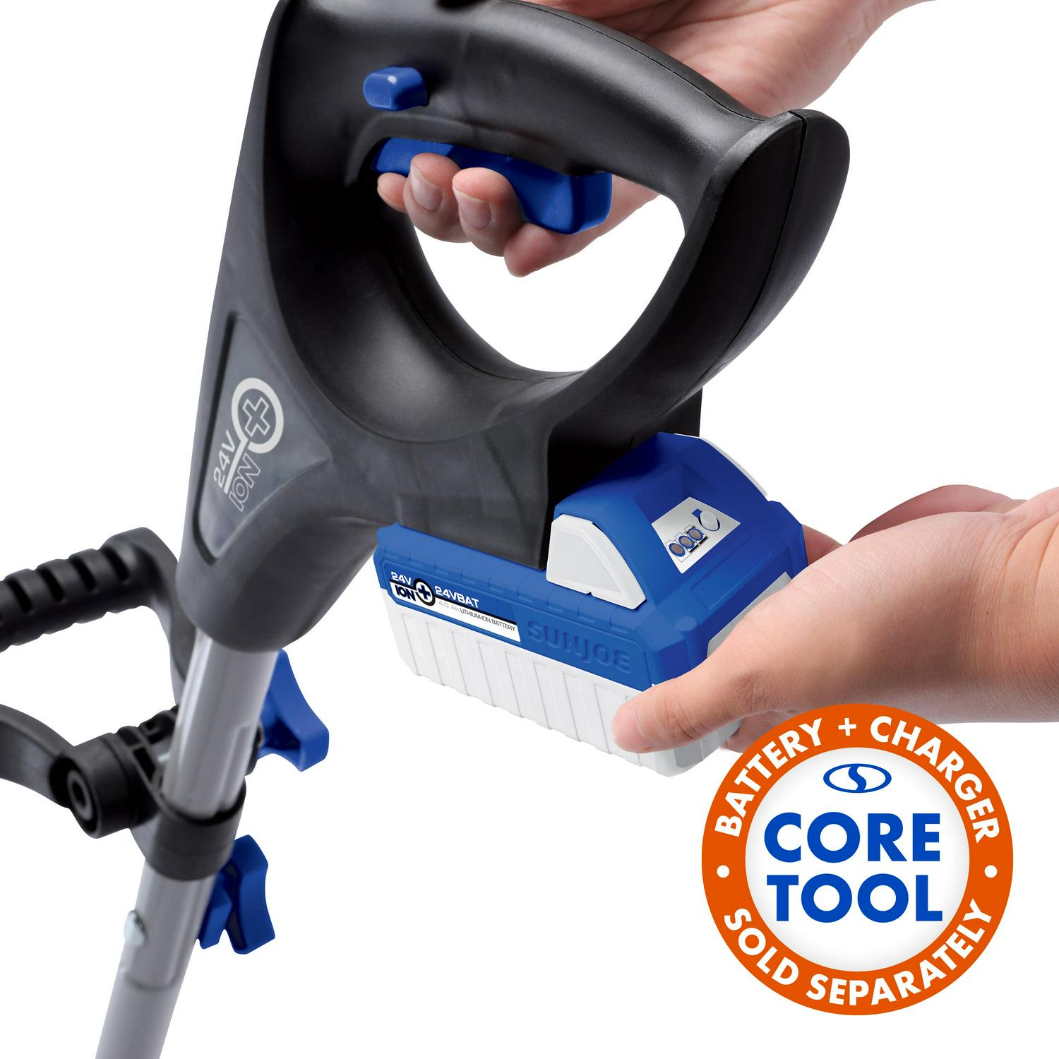 WHEN IT COMES TO SNOW, GO WITH JOE. Introducing the ultimate grab-n-go cordless snow-busting tool: 24V-SS10-CT from SNOW JOE. Combining innovation and functionality, SNOW JOE provides an easy, convenient and cordless solution to get snow out of your way this winter. Powered by SNOW JOE s exclusive IONMAX 24-Volt lithium-ion battery system (Not included with Core Tool), 24V-SS10-CT can quickly clear snow from your porch, patio, steps, sidewalk, and more. The light choice is the right choice with SNOW JOE! Weighing less than 10 lbs, 24V-SS10-CT blasts through up to 1632 pounds of snow per charge while the dual-handle design eliminates the need to bend and strain, maximizing user comfort and ease of use. Equipped with a heavy-duty 2-blade paddle auger, SNOW JOE throws snow up to 20 feet away, clearing a 10-inch wide by 6-inch deep path with each pass. And the durable scraper blade at the base of the unit lets you clear right to the ground without damaging your deck or pavement! When the job is done, 24V-SS10-CT stores easily inside of a hall closet for quick, convenient access. GET EQUIPPED this winter with the 24V-SS10-CT 24-Volt Cordless Snow Shovel from SNOW JOE and leave back-breaking snow removal behind you.