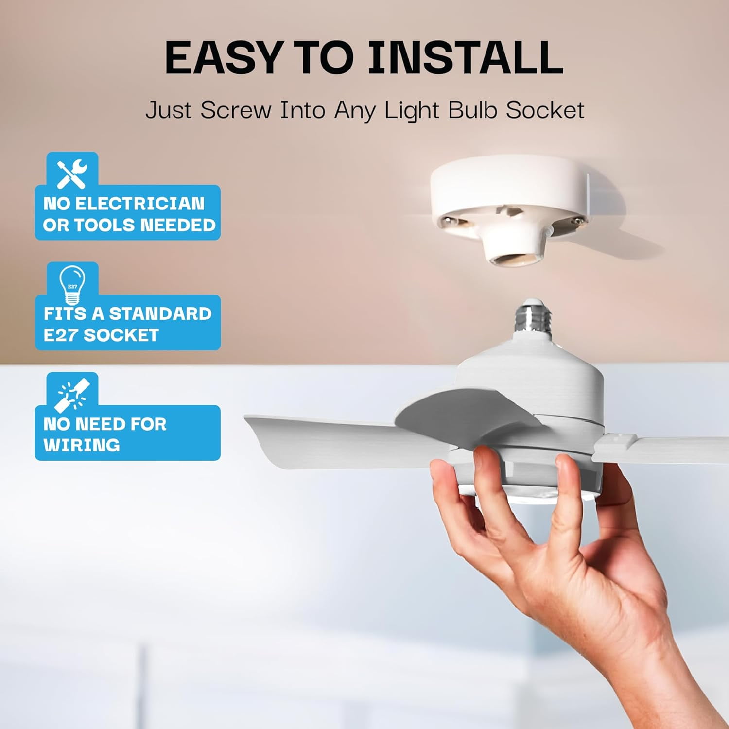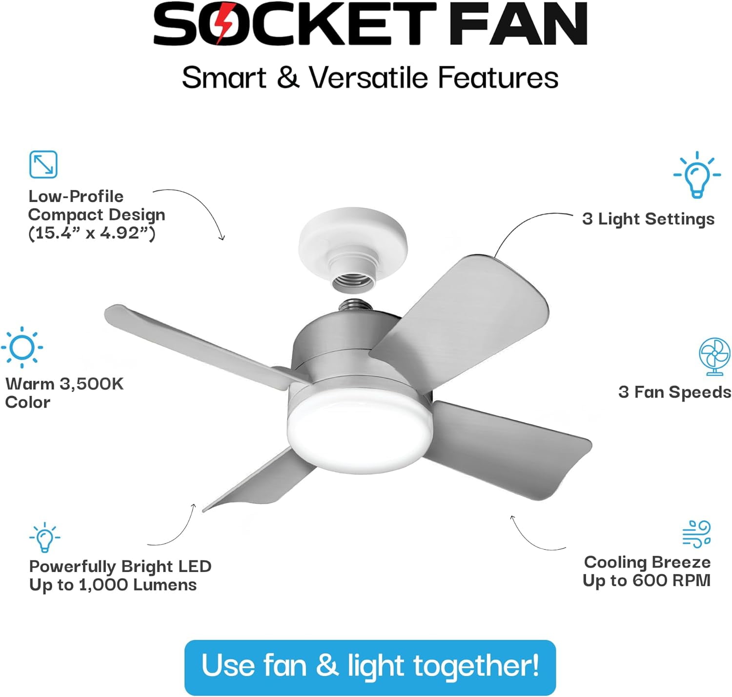Socket Fan Light – Warm Light Ceiling Fans with Lights, Ceiling Fan with Light Replacement for Light Bulb/Ceiling Fan for Bedroom, Kitchen, Living Room, Balcony, 1000 Lumens AS SEEN ON TV – Silver