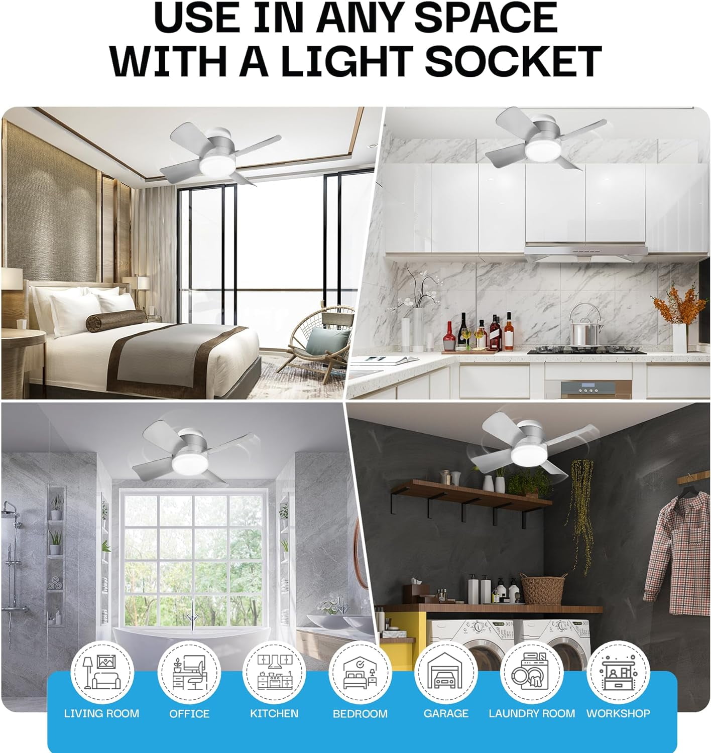 𝗖𝗲𝗶𝗹𝗶𝗻𝗴 𝗙𝗮𝗻 𝘄𝗶𝘁𝗵 𝗟𝗘𝗗 𝗟𝗶𝗴𝗵𝘁: Socket Fan by Bell + Howell allows your to get two uses out of one standard electric socket. The Socket Fan is both a ceiling fan and a super bright LED bulb in 1 unit, so you can illuminate and circulate air around your room without spending for two different products 𝗦𝘂𝗽𝗲𝗿 𝗕𝗿𝗶𝗴𝗵𝘁 𝗮𝗻𝗱 𝗖𝗼𝗼𝗹: 1,000 Lumens of super light will illuminate any dark room around your home; Model 8563 “Cool Light” comes with 5,000 cool color kelvins, for a more natural-colored bright light that’s easy on the eyes and reduced heat production. 𝗘𝗮𝘀𝘆 𝗜𝗻𝘀𝘁𝗮𝗹𝗹𝗮𝘁𝗶𝗼𝗻 𝗮𝗻𝗱 𝗪𝗶𝗿𝗲𝗹𝗲𝘀𝘀: Compared to traditional ceiling fans, the Socket Fan easily installs as you would a regular lightbulb, while also making it completely wireless and clutter-free. E26 base is compatible with most light bulb sockets 𝗦𝗺𝗮𝗿𝘁 𝗥𝗲𝗺𝗼𝘁𝗲 𝗖𝗼𝗻𝘁𝗿𝗼𝗹: Remote Control has 3 buttons: Light, Fan, and Off Button. Press Light Button several times to cycle through brightness modes (low, medium high and off); press Fan button to cycle through power settings (low, medium, high and off); Off button turns off both fan and light. Remote comes with mount you can install on to vertical surfaces (installation hardware comes included) 𝗗𝗶𝗺𝗲𝗻𝘀𝗶𝗼𝗻𝘀 𝗮𝗻𝗱 𝗙𝗲𝗮𝘁𝘂𝗿𝗲𝘀: This white ceiling fan product dimensions are 15.4 x 15.4 x 4.92″ from blade tip to blade tip and weighs a compact 1 pound and 4 ounces. The ceiling fan with light is screwable into any light socket and includes a socket extender, allowing you to simply install and remove the fan whenever and wherever you desire. 𝗣𝗼𝘄𝗲𝗿 𝗦𝗼𝘂𝗿𝗰𝗲: Socket Fan is a screw-in unit that you use as you would a standard lightbulb and operates using electricity