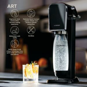The SodaStream Art black sparkling water maker celebrates the art of making your own fresh sparkling beverages at home. With a push of the lever, turn flat water into fresh sparkling water and customize it to your liking.