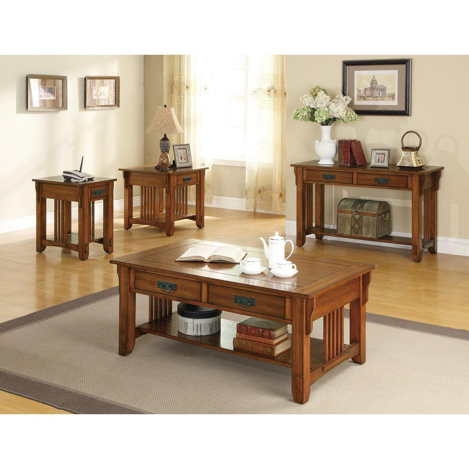 This occasional group is the perfect set for any traditional living room. Crafted with a warm brown oak finish, it livens up a room with its presence. The most stunning design aspect includes the butterfly knot inlays on the table top. Drawer and storage shelves provide space for home accents and accessories.