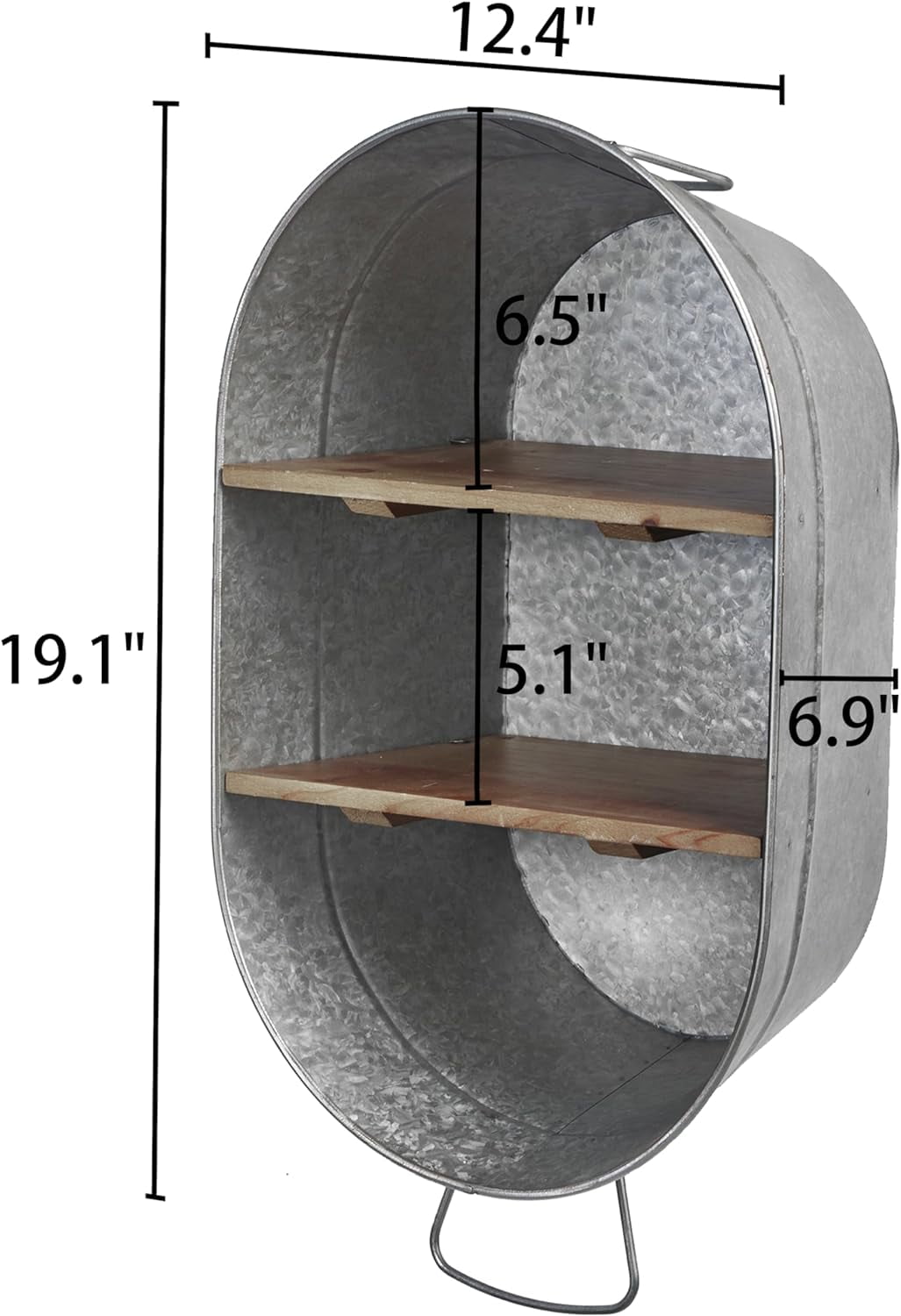 Full of farmhouse flavor. The galvanized design of the entire floating shelf is very bright, fully demonstrating the charm of farmhouse style. No matter what style of room it is, the rustic oval wall shelf will fit in nicely. Size:19.1″ x 12.4″ x 6.9″. Wood display shelf has a certain weight-bearing capacity, so you don’t have to worry about it being deformed and so on. The space is very sufficient, enough to meet your daily needs. Built to Last. Our galvanized washtub is made of premium metal, which provides corrosion protection against oxygen and water. The shelves of this hanging storage organizer are made from high quality wood so as to add its texture sense. The washtub shelves will surely last for long time. Versatile Washtub Shelf. This galvanized tub has two wooden shelves for hand towels, toiletries and unique items that best express your own hobbies. The handle below is perfect for hanging a towel for washing hands, and the storage rack can also be used to store spices and condiments in your kitchen, or even as a way to display decorative items such as books, framed pictures, and potted plants in your living room. Perfect for Your Bathroom and More. This galvanized washtub shelf provide much needed storage for toilet paper, hand towels, soaps, and other bathroom needs. It can be hung over the toilet to optimize your bathroom storage needs, making a beautiful addition to your bathroom decor, and also makes a perfect addition to any room, such as living, entry, laundry, kitchen, bedroom, office, kid’s room.