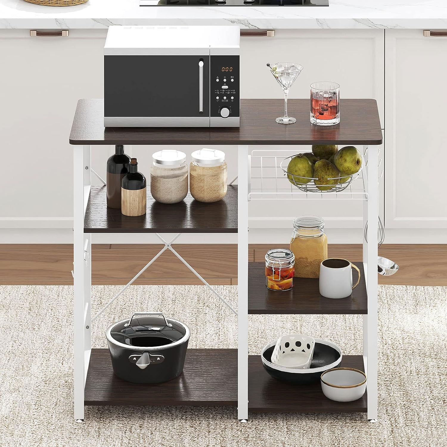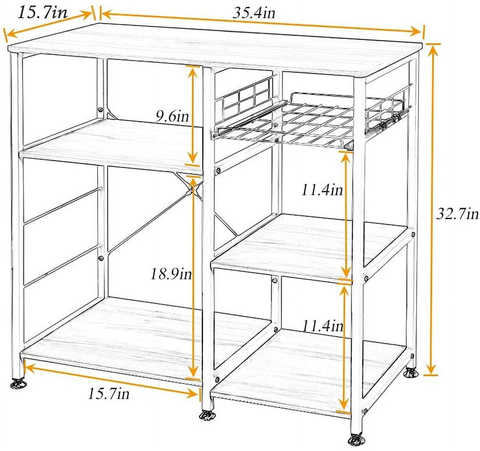 Multipurpose Kitchen Shelf: SOGES kitchen storage shelf protects your health and safety. Set with 3-Tier+3-Tier It is a great choice to be your kitchen storage shelf, Microwave Stand, Baker’s Rack, Kettle, Spice Rack Organizer and kitchen island. Sturdy & Easy Cleaning Construction: The kitchen standing shelf is constructed by high quality P2 MDF Metal Frame. With a wet cloth, you can wipe dirty stains easily from the smooth surface. The metal frame offers a large weight capacity. ” X” style design provides more support and ensures stability and durability. Space Efficient Kitchen Organizer: This is a good storage solution for a small kitchen or other small space. The multi-layer design allows your messy objects to have their own location, so as to keep the room in order. Wide Range of Application: Simple and classic appearance design makes it perfect for all kinds of decoration style rooms. The ingenious design increases its practicability, making it very suitable for kitchens, apartments, restaurants, or any place where additional storage space is required. Specifications: Made of enhanced water-proof and anti-scratch P2 board Kitchen storage shelf with 3-Tier+3-Tier Use heavy-duty and powder-coated metal materials The rustic design allows it to easily complement your homes and office decor Wide application, perfect for home, apartment, restaurant and other places that need additional storage space. Requires assembly Overall size: 35.4 inches (length) x 15.7 inches (width) x 32.7 inches Gross weight: 29 pounds Packing: 1 * Kitchen Storage Shelf