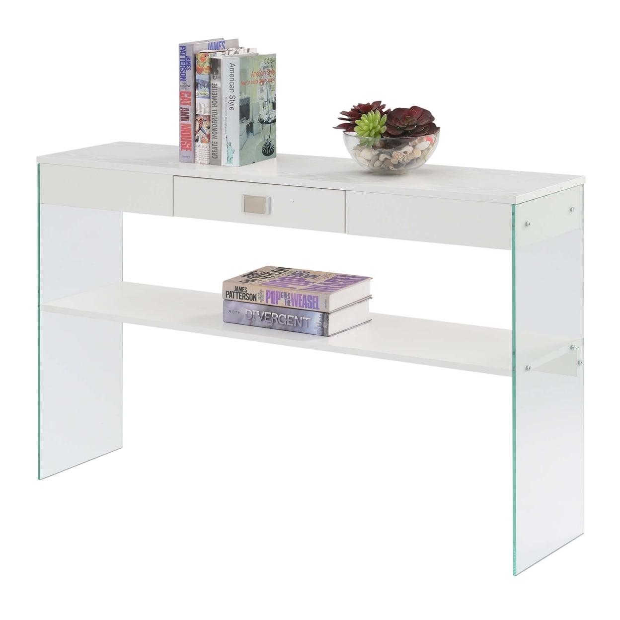 SoHo 1 Drawer Console Table Need a little something extra to complete your modern home look The Soho 1 Drawer Console Table by Convenience Concepts is your solution! This table showcases a sleek contemporary look while remaining versatile. Place this console anywhere in your home from the entryway, living room, hallway, and more! Featuring a second tier of shelving to display decorative items and collectibles. Utilize the drawer, which is on metal glides, to store keys, mail, or any unsightly accessories. Made from particle board and tempered clear glass, this table is built for durability and easy maintenance. Complete your modern home look by shopping the complete SoHo Collection by Convenience Concepts, each sold separately.