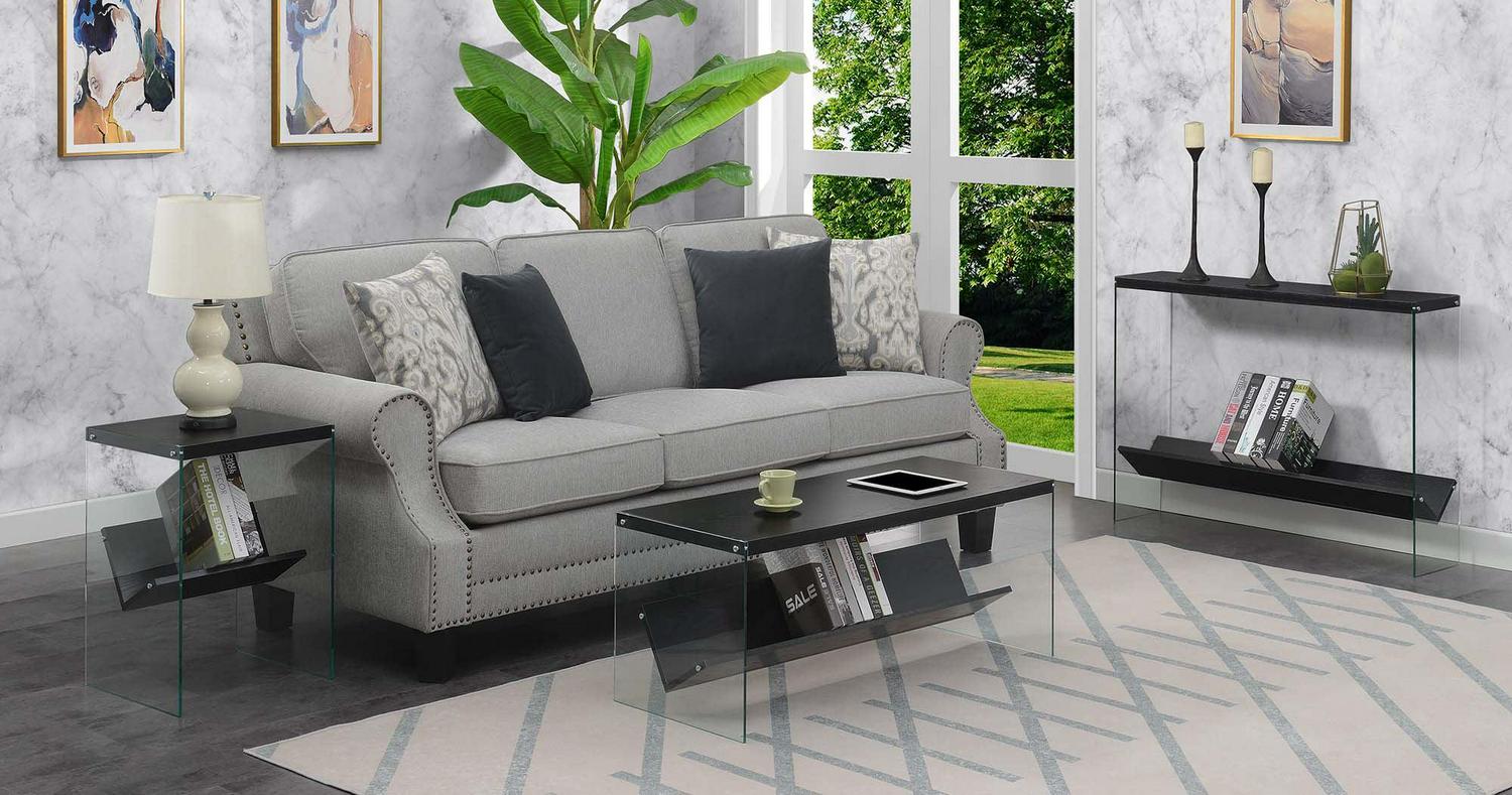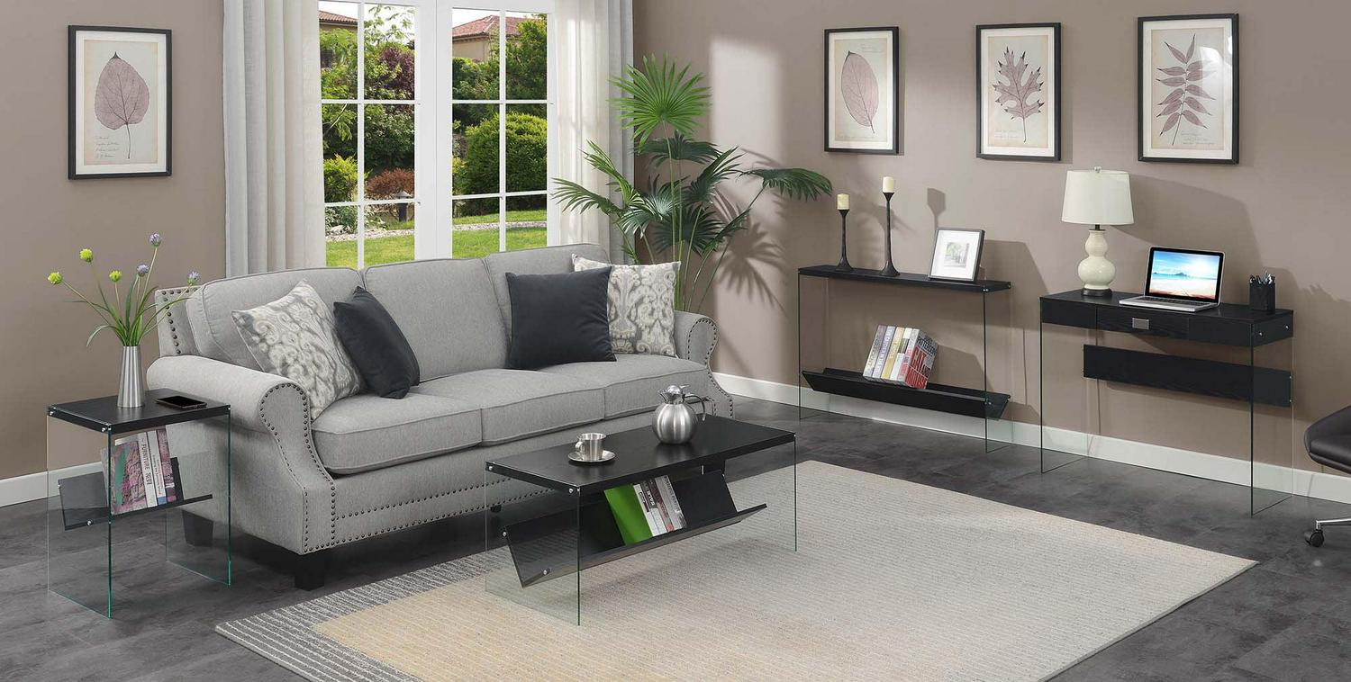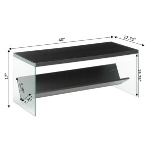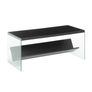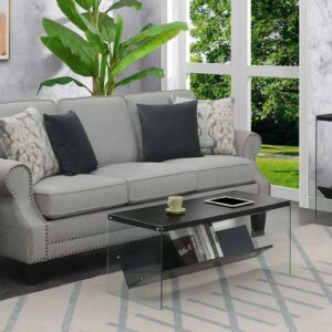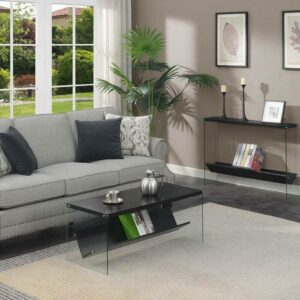 SoHo Coffee Table with Shelf, Black Add a modern twist to your living space with the SoHo Coffee Table with Shelf by Convenience Concepts. The sleek tempered glass sides and spacious tabletop accommodate books, beverages, and much more. Sturdy and stylish, this accent coffee table is ideal for placement in your living room, family room, or any entertainment area. Show off your books or movie collection with this convenient bottom shelf made for storing entertainment favorites or other storage needs. Pair with additional modern pieces from the Soho collection by Convenience Concepts, each sold separately.
