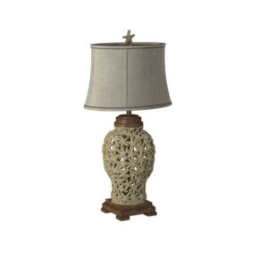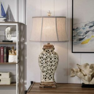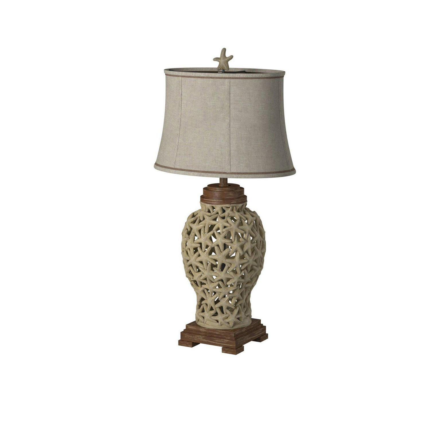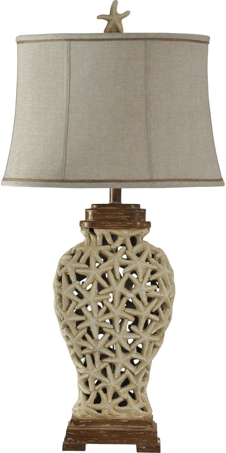 A beach-themed table lamp with a brown and beige finish, this fixture is an ideal accent to coastal décor. The beige frame is an openwork design of numerous small starfish, and the base and top feature a distressed brown finish. The softback fabric shade is beige, and there is a sea-star finial at the top, making this ocean-inspired lamp an eye-catching fixture for a hallway, dining room, office, bedroom, or living room.