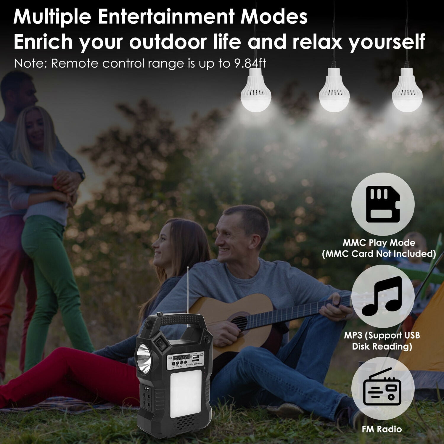 Solar generator is a practical tool both garden use and outdoor camping use. Dual ways supply power for our power station. Come with a flashlight, lighting panel and 3 lighting bulbs, illuminate for you when power outage or in outdoor environment. Support multiple entertainment modes, such as FM, MP3 and MMC. Relax yourself when in camping. Multi-port USB charging cable enables you to charge daily used items, such as electric shaver, USB fan, etc.. Portable Solar Power Emergency Power Backup:Perfect emergency power backup for home,travel,camping. Rechargeable battery solar generator system with larger power capacity 8000mAh,storage solar generator power to battery and supply power to LED light and mobile phone. Dual Way To Charge Power Station:Two methods for you to choose. Easy and Fast! Powered by solar or by included charging adapter. The solar panel needs to face directly to the sun and the weather condition may influence its charging time. Up To 30Hrs Runtime:With a flashlight,12LED beads lighting panel and 3 extra 3W bright white LED bulbs,Low power consumption,long-lasting lighting time and durability. Up to 30 hours of a bulb lighting per time. Multi-functions:Digital LED display,built-in MP3 player &FM radio,support USB & MMC card. 4 Ports 6V output to LED bulb light,dual USB 5V DC Output with an included multi-port USB cable,for your tablets,iPhone,iPad,laptops,fans,digital camera and USB shaver charged up. Note:We only include 3 light bulbs.