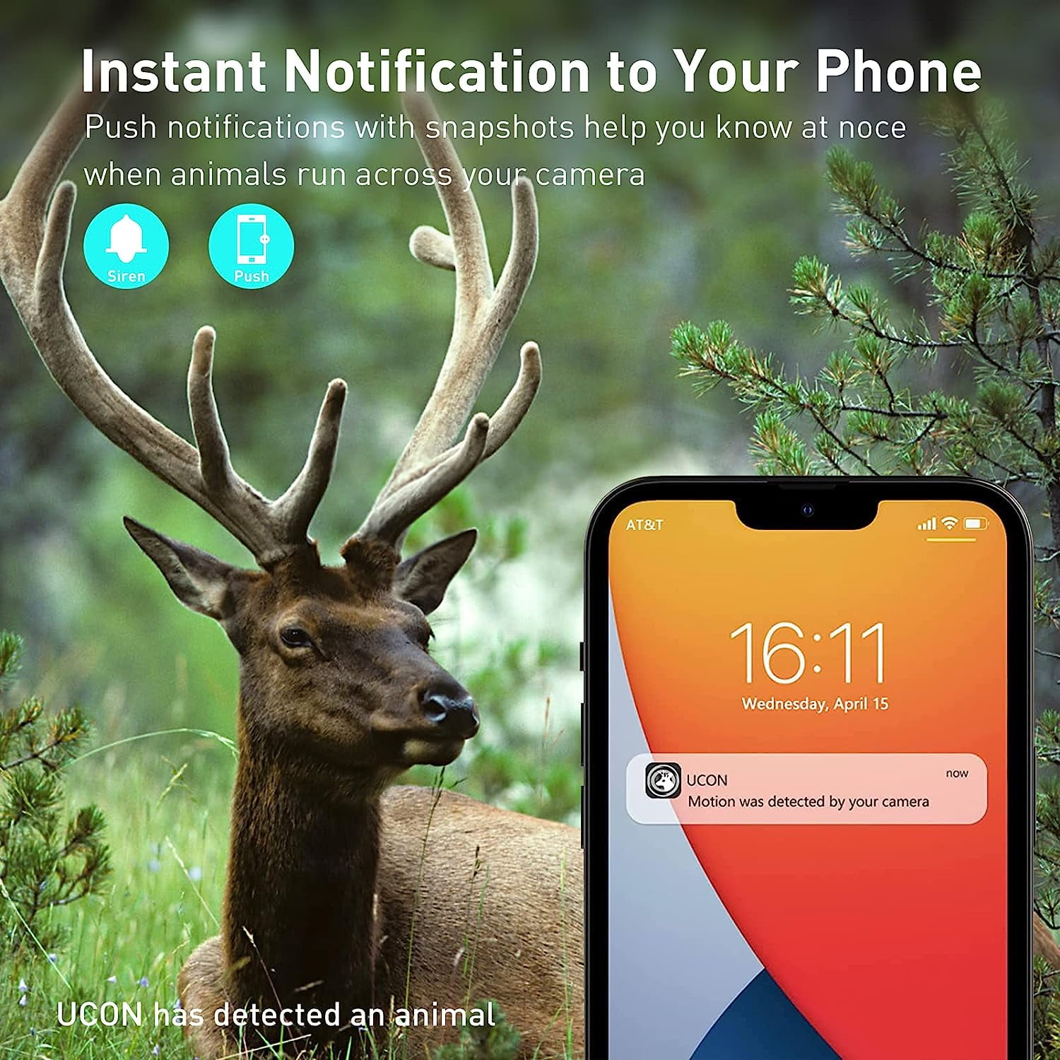 Soliom S50 is 4G Wildlife Camera That Can Pan and Tilt to offer 360° Full View for Wild Area Where 3G/4G Network Covered. 【4G Pan Tilt Lte Trail Camera】This cellular trail camera can work anywhere nationwide with 3G/4G LTE coverage,support 4G cellular network (Verizon, T-Mobile, AT&T) for hunting, countryside, farms and outdoor places where is no WiFi covered. The US SIM card includes 300M free cellular data. 【6W Solar Panel and 32GB SD Card Included】Equipped with 6W solar panel and 10400mAh high-capacity battery, this solar trail camera provides non-stop power anytime, suitable for anywhere nationwide where are 4G LTE coverage. In addition, 100% wired-free, no WiFi needed, IP66 waterproof and camouflage body, ideal for wild areas, farms, ranches,cabins and forest. 【Live Video View with Cellphone App Remote Control】This cellular game camera supports phone remote access and control. You can see the live video view anytime and anywhere by the wireless wildlife camera and share your hunting camera with your family via the free UCon App. 【2K Crystal-Clear 1080P HD Trail Camera】This 4G trail camera capture detail with its 2K resolution and IR LEDs, and provides crystal-clear HD videos day and night. With a 355°pan and 90°tilt, Which allows it to monitor a large area and provide almost complete Coverage without blind spots. So it also can be used as a cellular security camera. 【Phone Playback & Motion Activated Alerts】This Game camera built in intelligent algorithms and a PIR activated sensor which performance better and reduce false alarms. The Motion-activated alerts will be sent in real-time to your cell phone.Video and images can be stored in a micro SD card (up to 128GB). It includes a 32G SD card.