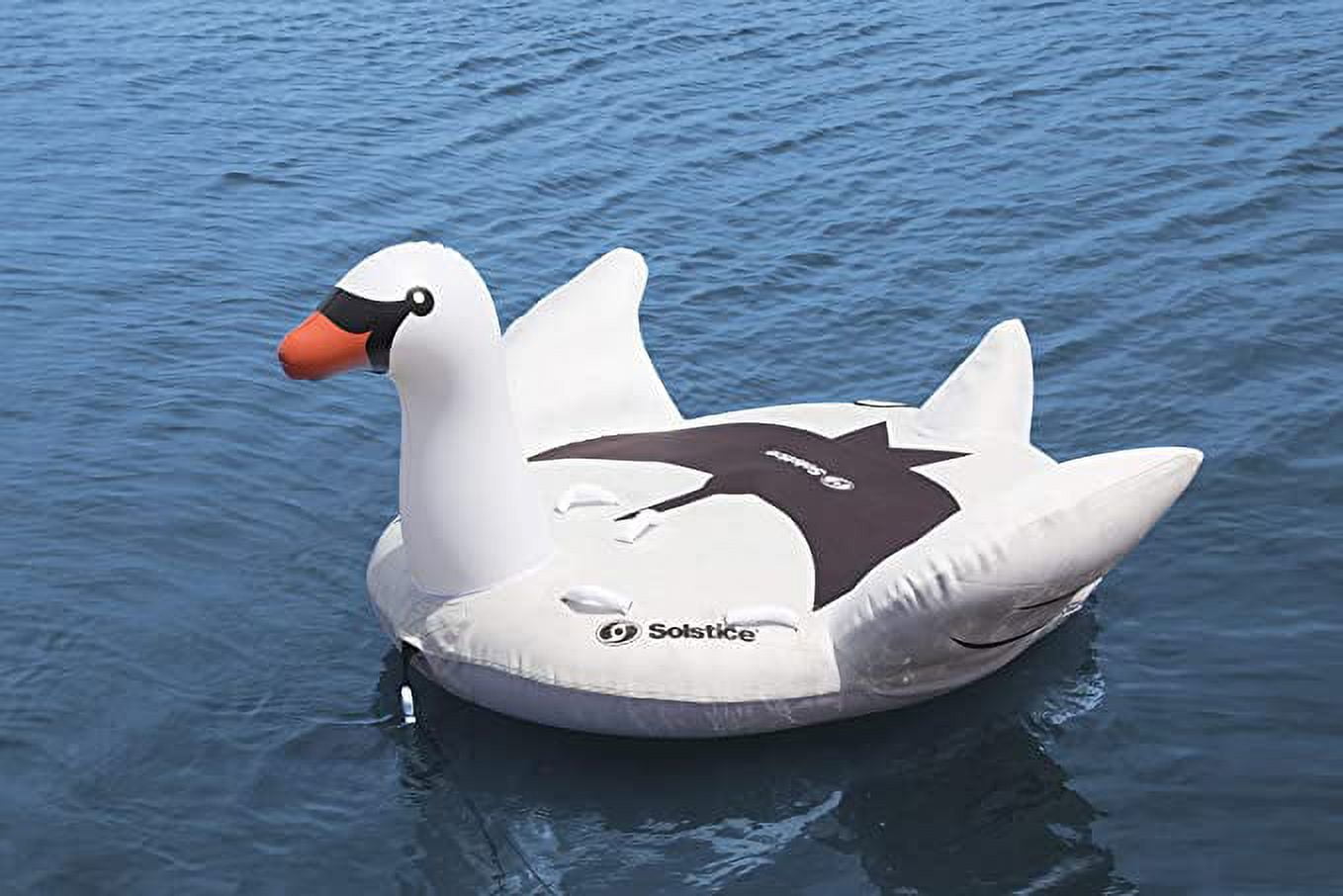 Gracefully glide over the water in style on this towable swan. Durable and comfortable, this iconic swan is made to accommodate 1-2 riders. Designed thoughtfully with a nylon cover, comfort grips and a quick connect adapter for tow rope to make your experience as seamless and fun as possible. Now you can grace your favorite calm body of water with the unique swan towable. Always wear a properly fitted life jacket, and never tow more than one tube at a time, or use tube as a personal floatation device. Always ensure tow rope is clear of all body parts prior to and during use.