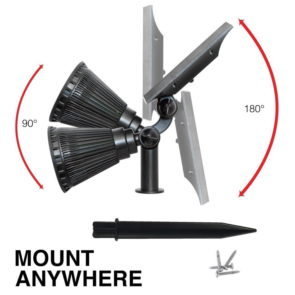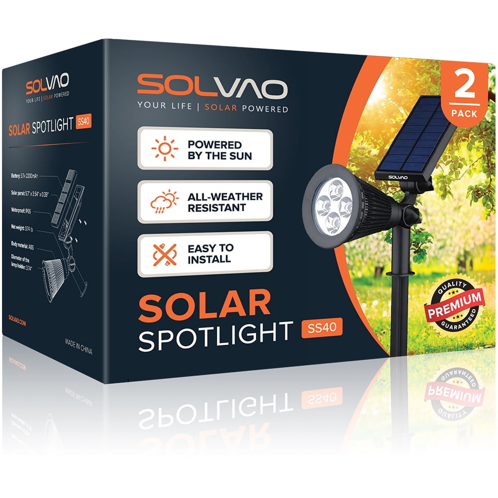 The SOLVAO SS40 solar spotlights provide a versatile solution for outdoor home and landscape illumination. These spotlights are bright, weatherproof, and solar-powered, with lamp heads that can be staked in the ground or mounted on the wall to brighten any part of your home or garden. Utilizing a full 180 degree range of motion, the SS40 solar lights can be used to light up your outdoor pathway, walkway, driveway, garden, flag pole, trees, and any other area of your yard or property. Battery-free, wire-free, and completely self-sufficient, the SS40 solar LED spot lights can add convenience and security to an exterior space, all with the power of the sun. At a bargain price, these outdoor spotlights deliver premium features such as IP65 waterproofing and multiple operating modes. Add one or more SS40 solar spotlights to transform your property and impress your neighbors with absolutely no operating costs or maintenance required. Simply stick in the ground or mount outside and let the adjustable, high-efficiency solar panel do the rest.