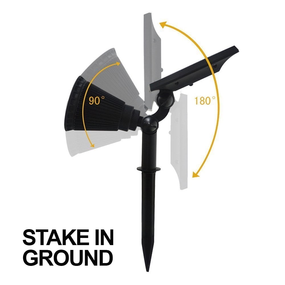 ADD SUPER BRIGHT UPLIGHTING to your garden, walkway, palm trees, driveway, backyard, flagpole, garage, and anything else you can think of around the exterior of your house and landscaping. Impress your friends, family and neighbors with these flexible, easy to install solar power spotlights! And add security by keeping your property lit up at night. UPGRADED 200 LUMEN SPOT LIGHT + WALL & GROUND MOUNT: 3rd generation spotlight is brighter than ever. 4 LEDs with 50 lumens each (200 total lumens) provide the brightest, most powerful wireless solar lighting available on the market. Switch between High and Low modes allowing you to control the brightness of your spotlight. Easily stick the stakes inground or mount on a wall or fence (screws included). EXTRA LARGE, 180° ADJUSTABLE SOLAR PANEL WITH FROSTED COATING: upgraded, larger solar panel with rechargable 18650 lithium ion battery (2200 mAh) puts more of the sun’s energy to use, resulting in 8-10 hours of light! Frosted panel keeps dirt and dust from gathering and blocking sunlight from the solar panel and is adjustable to help the solar panel catch maximum sun rays. The lamp head of this item is also adjustable! AUTO ON/OFF SENSOR: this 2 pack of decorative solar uplights automatically turn on at dark and off at sunrise. Low brightness mode utilizes low voltage energy, allowing the lamp to stay lit from dusk to dawn! User tip: the lights will not illuminate if the automatic sensor detects any outside light! IP65 WATERPROOF & HEATPROOF W/ ALL-WEATHER RESISTANT BUILD: this spotlight can withstand exposure to the elements and be left outside during rain, snow, or severe heat. 2-in-1 installation includes ground stake for uplight feature or wall mounting. Para aquellos que hablan español, estas focos luces solares ofrecen iluminación exterior ultra brillante para el exterior de la casa, el jardin y el paisaje. PRODUCT SPECS Waterproof level: IP65 Charging time: 6-8 hours Working time: 6-9 hrs (low brightness), 3-5 hrs (high brightness) Battery: 18500 lithium battery 3.7V 2200mAh Brightness: 200 lumens (50 lumens per bulb) Dimensions: 7.3″ x 5.75″ x 14.6″ FEATURES 2 modes – high light mode & dim light mode No wiring or batteries required – simply stick in ground or mount on wall and enjoy Great sleek black floodlight for decorative tree, lawn, deck, patio, pool, path dock and more Solar-Powered, Low Voltage, Stake or Hang, Automatic Adjusted 270 degrees up or down (180 degrees for the panel, 90 degrees for light head) All-weather resistant- you can leave these out all year long PACKAGE INCLUDES 2 x Solar Spotlights 2 x Spike 1 x Manual 6 x Screws