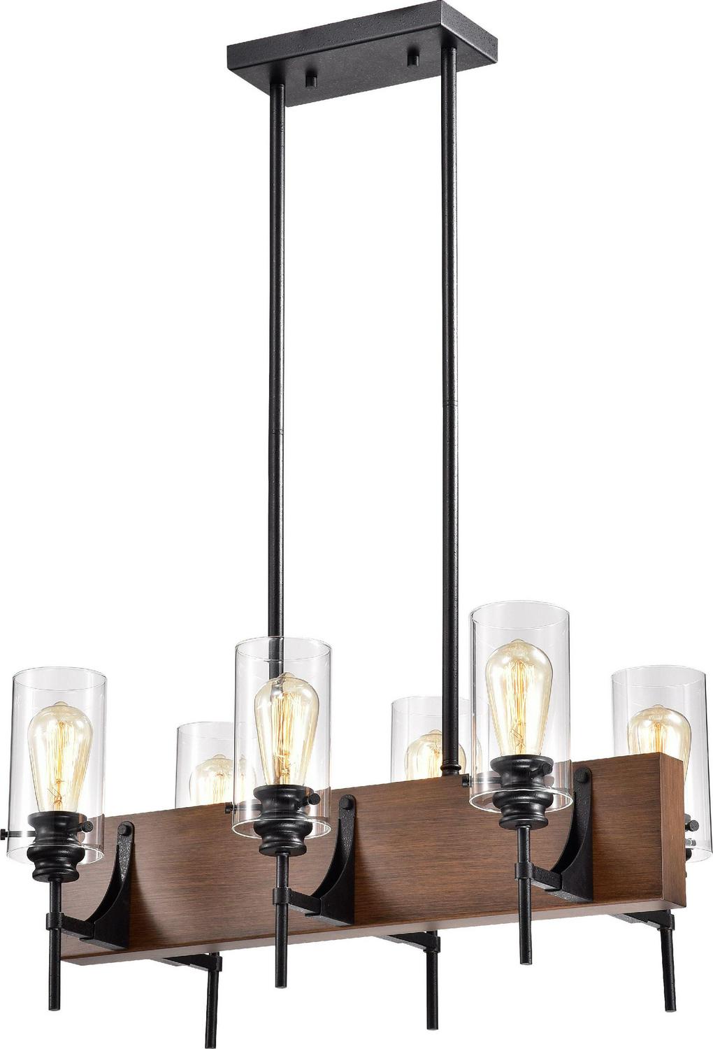 Solvyr Forged Black Metal and Wood 6-Light Chandelier with Clear Glass Tube Shades