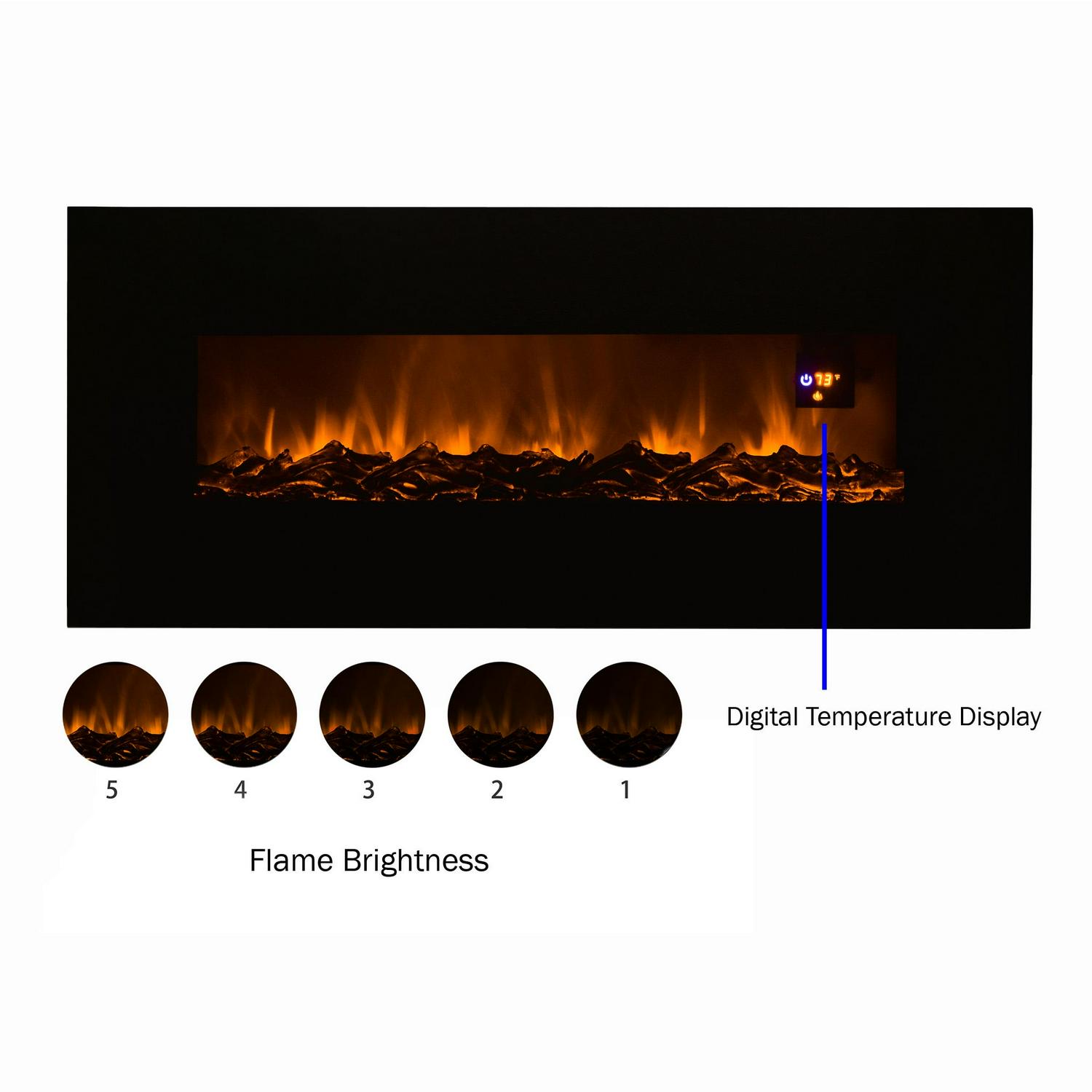 Bring valuable warmth to your space with this Somerset Home 50-Inch wall-Mount bottom vent electric fireplace. This sleek black electric heater fire place gives your choice of 750 to 1500 watts of heat on two separate heat settings, so you can customize your room’s comfort level. Realistic orange LED flames dance in the firebox alongside faux logs, creating a welcoming ambiance in an instant.