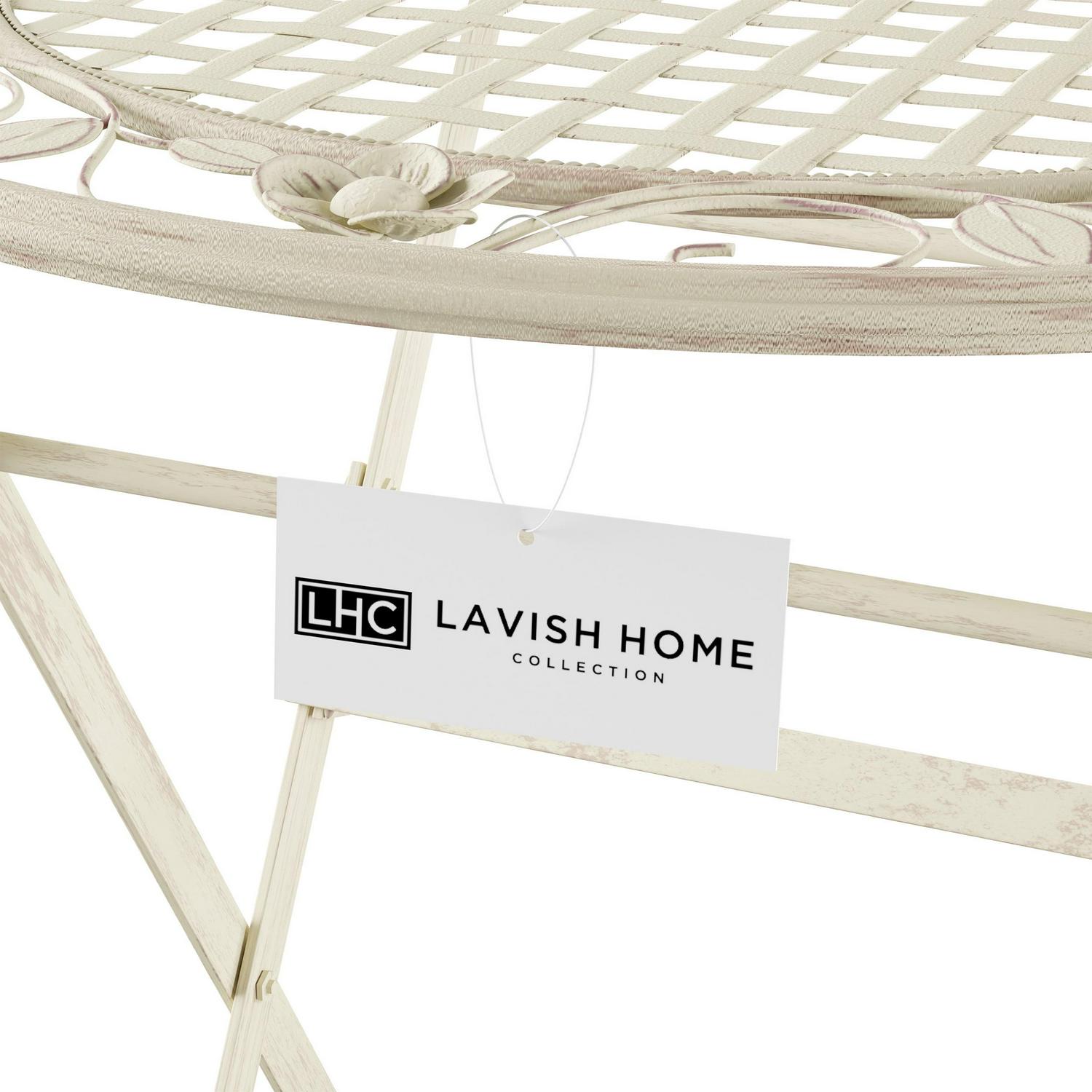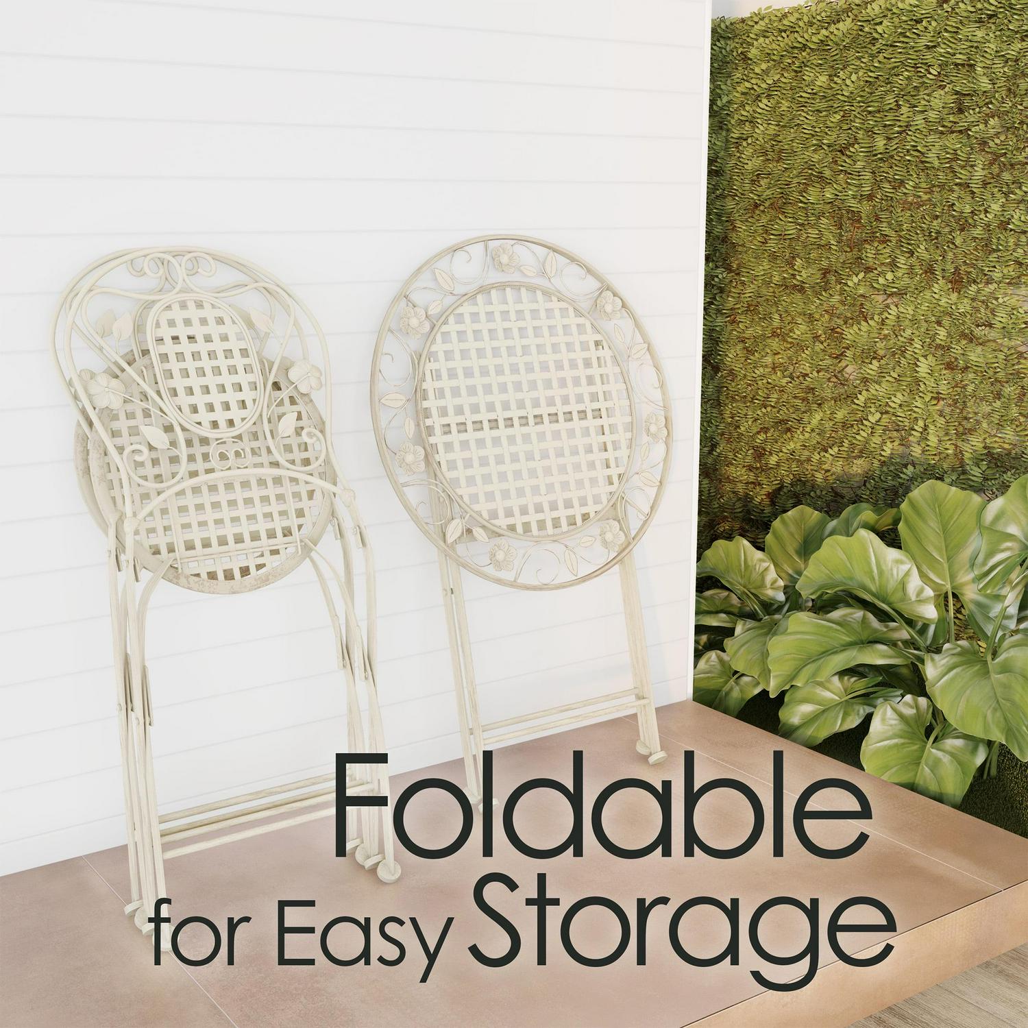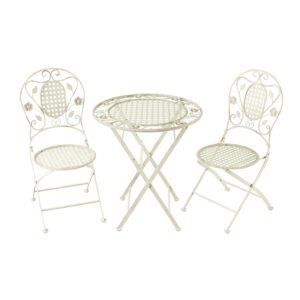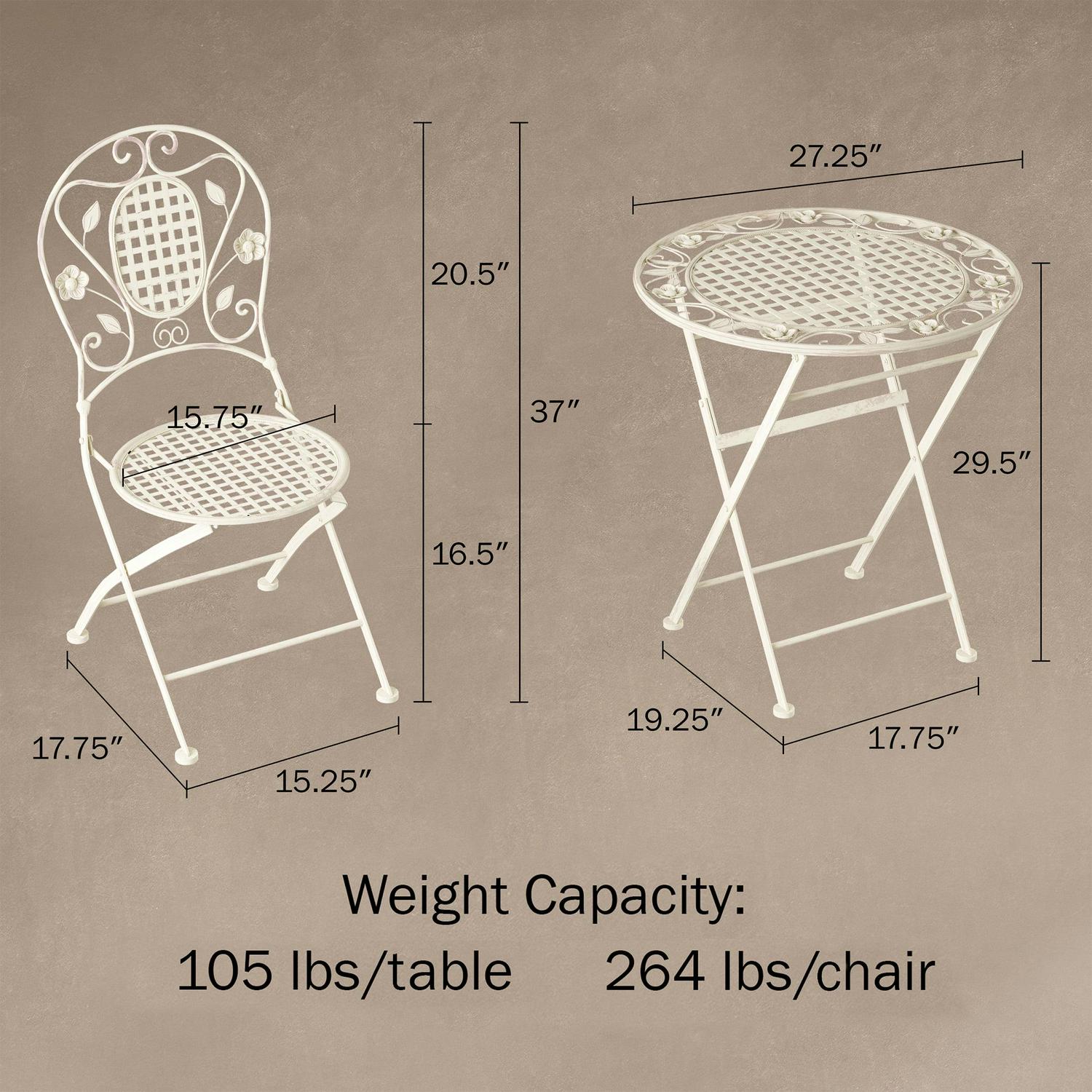 The Folding Bistro Set is a stylish touch that adds additional seating to your porch, patio, or any outdoor area. The laser-cut lattice and leaf design and antiqued white finish lend an attractive look to this durable and functional table and chair set. The powder-coated wrought iron frame ensures that the set is rust, fade, chip, and crack resistant, and can stand up to the elements outdoors. The bistro set conveniently folds up for easy storage during off-seasons or when it’s not in use. This charming table and rounded chair set is a wonderful piece for sunrooms, balconies, or pool areas and is sure to make a fantastic gift for birthdays, holidays, housewarmings, weddings, and more.