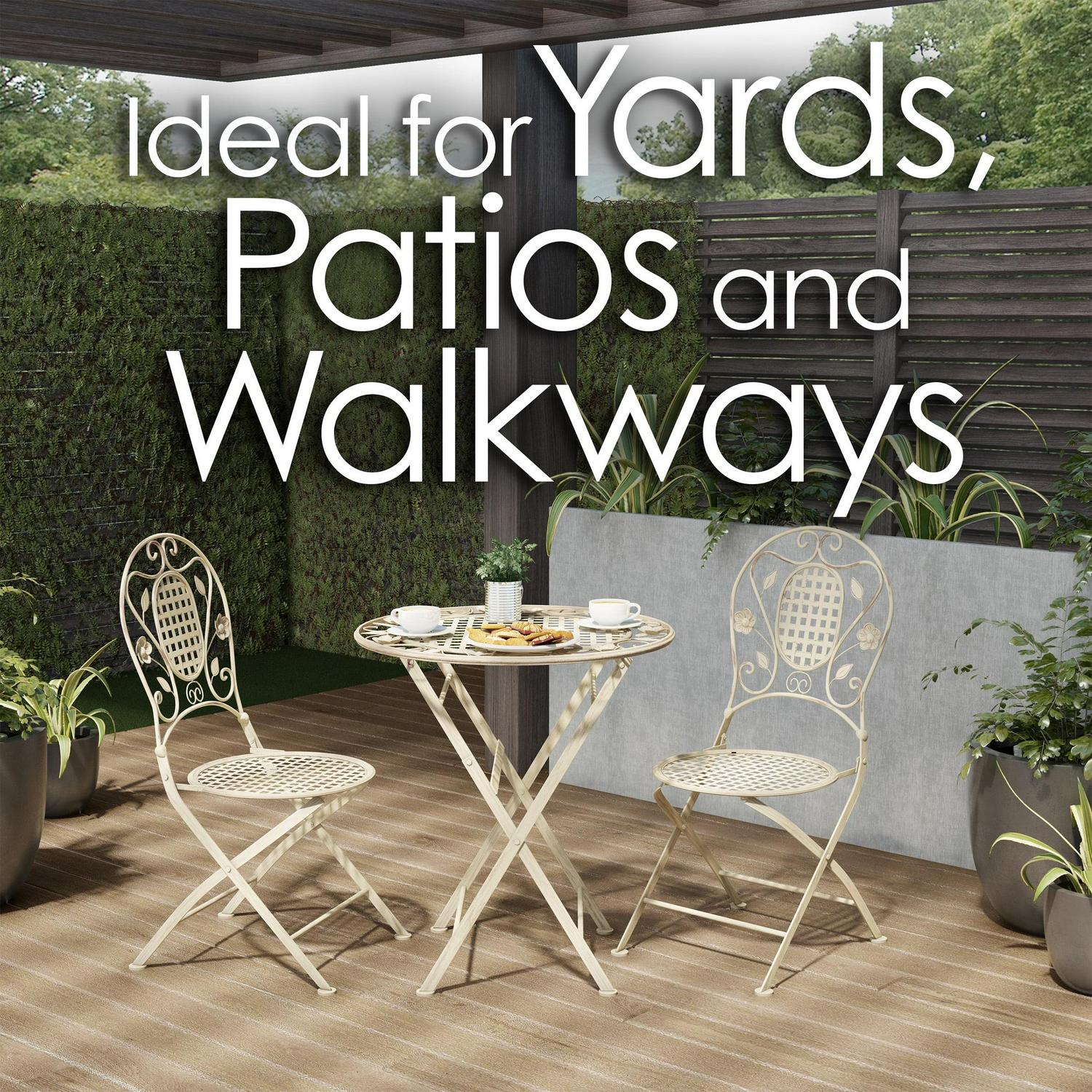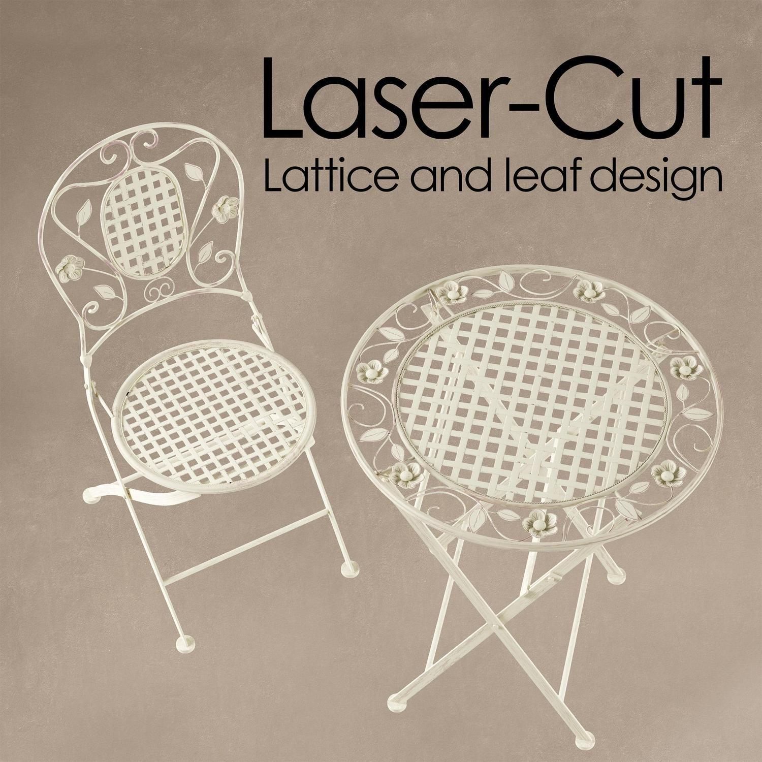 – STYLISH AND FUNCTIONAL – The laser-cut lattice and leaf design and antiqued white finish lend an attractive look to this lovely bistro set that provides seating for up to two adults; it’s the perfect spot for an outdoor breakfast or evening drink
