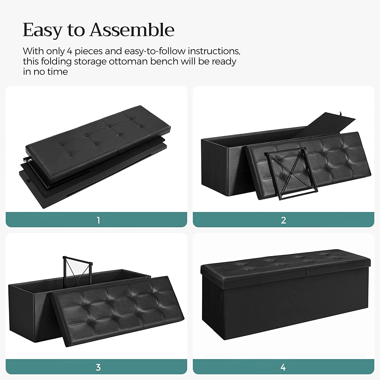 Features: FLIP LID & COLLAPSIBLE DESIGN: The lid of the foldable ottoman can be opened and folded from both sides easily, convenient for taking out or putting in your items without removing the entire lid; fold the leather ottoman bench to save space when not in use LARGE STORAGE SPACE: Spacious inner space of 120 L to provide multiple storage options to hide away sundries, hold kid’s toys, blankets, pillows, magazines, clothes, etc, maximizing your space in a smart way STURDY & DURABLE: Crafted with high-quality MDF, solid steel frame and the removable separating board support this leather storage ottoman bench, ensuring great stability, practical and perfect home furniture as a shoe bench, footstool, bed bench and toy chest HEAVY LOAD CAPACITY & COMFORTABLE: The maximum static load weight is up to 660 lbs (300 kg) it can hold up to 2 – 3 adults with ease; the foam padded cushion makes it comfortable to sit on and easy to clean SECONDS TO ASSEMBLE & EXTENSIVE USE: Constructed with only 4 simple parts, this bedroom bench takes a few seconds to set up for fast use, suitable for living room, bedroom, entryway, lounge and more Specifications: Color: Black Material: Faux Leather, Foam, MDF Load Capacity: 660 lbs (300 kg) Product Size: 43 1/2″ L x 14 7/8″ W x 14 7/8″ H (110 x 38 x 38 cm) Inner Size: 42 1/8″ L x 13 3/8″ W x 13 1/4″ H (107 x 34 x 33.5 cm) Net Weight: 18.9 lbs (8.6 kg) Gross Weight: 20.7 lbs (9.4 kg) Package Contents: 1 x Folding Storage Bench 1 x Instruction Notes: This product is not used as a toy; do not allow children to climb or playing to avoid tipping and expected injury. Do not stand on the product or use it as a ladder or climbing tool.