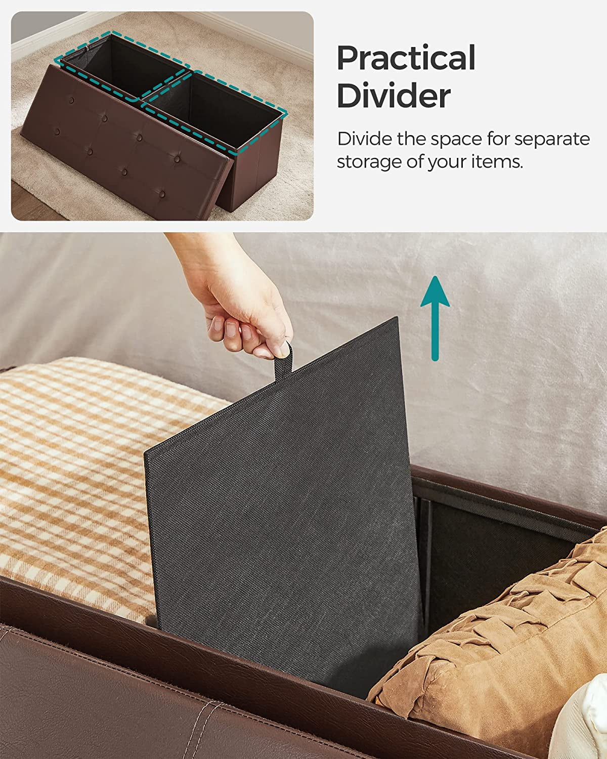 Features: HIDDEN STORAGE SPACE: Extra-large volume of 120 liters is sufficient to meet various needs. Place it in your bedroom, living room, hallway, or utility room to organize books, clothes, blankets, shoes, toys, and many other sundries STURDY & COMFY FOR SITTING: Constructed by CARB P2 MDF, this ottoman bench holds up to 660 lbs. (static load capacity), easily seats 2-3 adults. Highly resilient foam padding ensures a comfortable sitting experience CLASSIC DECORATIVE APPEARANCE: Covered with premium faux leather, this storage chest is super easy to wipe clean with a damp cloth. A button-tufted bench top with double stitching lines brings style to your room SUPER EASY TO SET UP & FOLD FLAT: Collapsible design makes it easy for you to set up a cozy padded bench within seconds. Can be easily folded flat when not in use, storage takes little space. Perfect for dorms and RVs EXCELLENT FOR SMALL SPACES: Multi-purpose ottoman works great as shoe bench, footstool, window bench, bed stool, toy chest, coffee table, puppy step, etc. Sized 43″ L x 15″ W x 15″ H (110 x 38 x 38 cm) Product Specification: Color: Brown Upholstery Material: Faux Leather Seater Filling Material: Foam Construction Material: MDF (Medium Density Fiberboard) Product Dimension: 43″ L x 15″ W x 15″ H (110 x 38 x 38 cm) Shipping Weight: 21 lbs. Package Contents: 1 x Folding Storage Ottoman