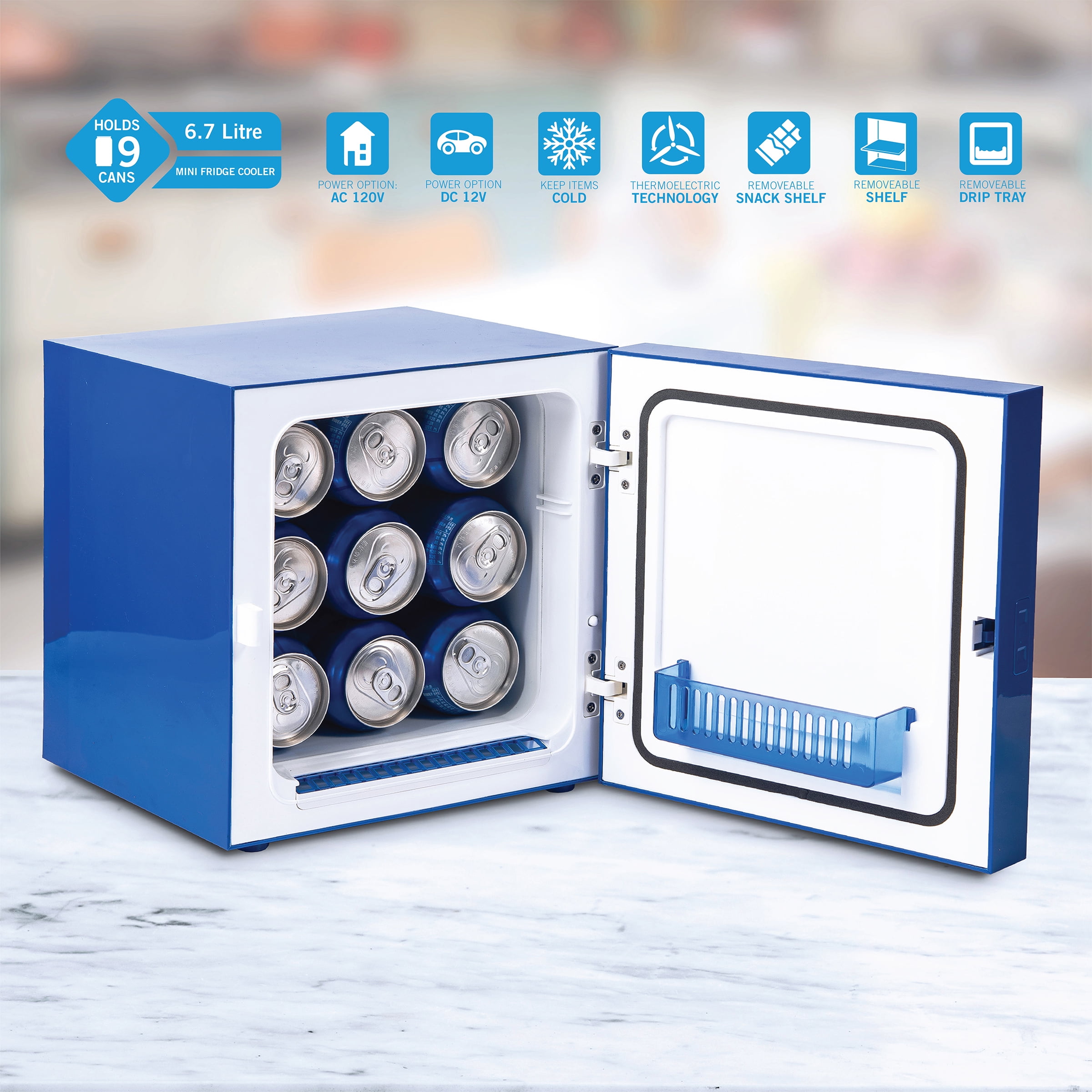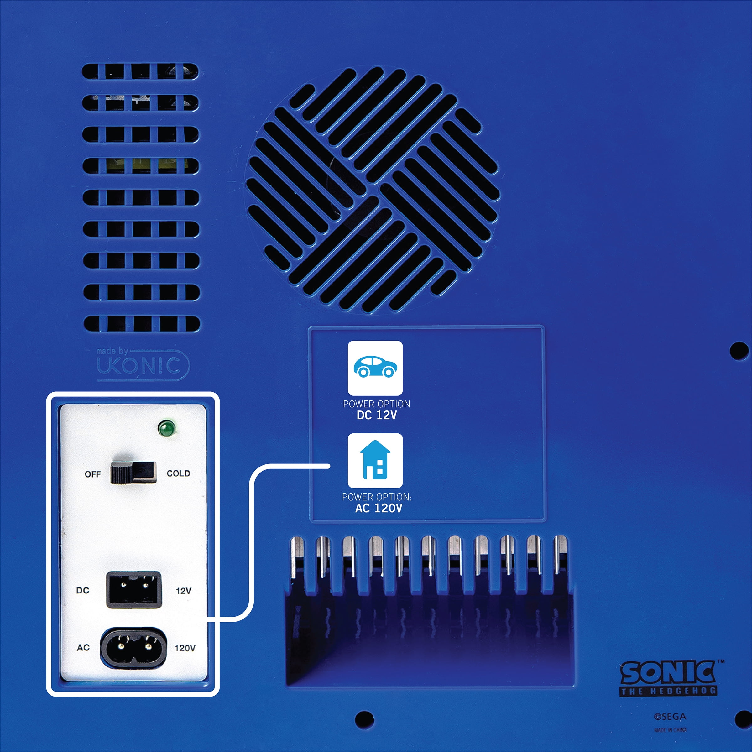 Classic Video Game Cool: Thermoelectric cooler with Sonic the Hedgehog on the front Compact Size Fits Anywhere: 10.4″ tall x 10″ wide x 10″ deep Stay Hydrated on the Go: Perfect for your dorm, office, gaming setup, or even your car, truck, or RV Power Up: 6.7 L capacity—holds up to 9 12 oz. soda cans Green (and Blue) Technology: Engineered with thermoelectric technology, free from CFCs and refrigerants Chill Out: Cools to 36°F below ambient temperature The Entire Package: Includes cooler, 120V AC power cord, shelf, 12V DC cable (vehicle power), removable shelf, door shelf, and instructions