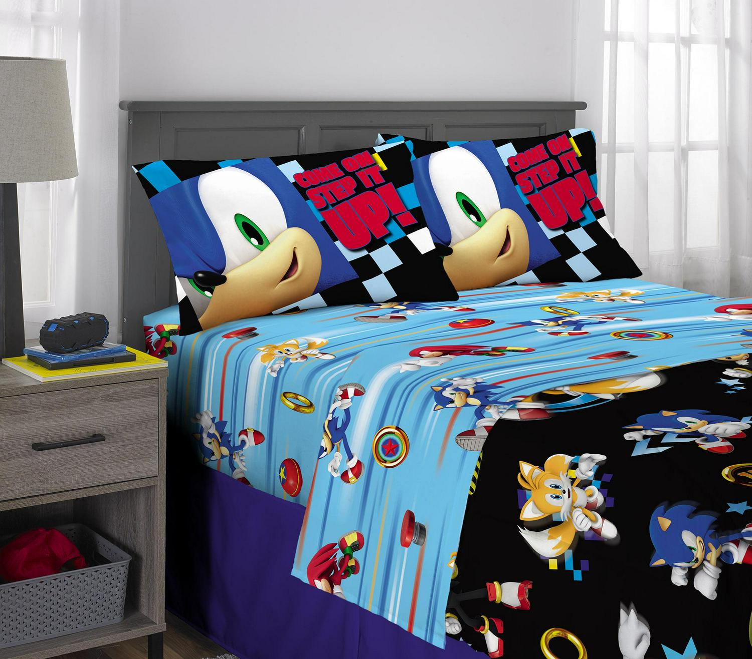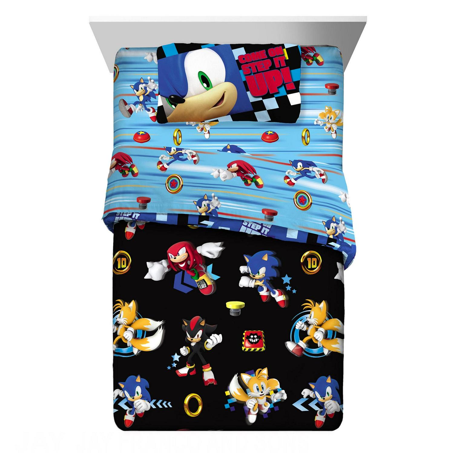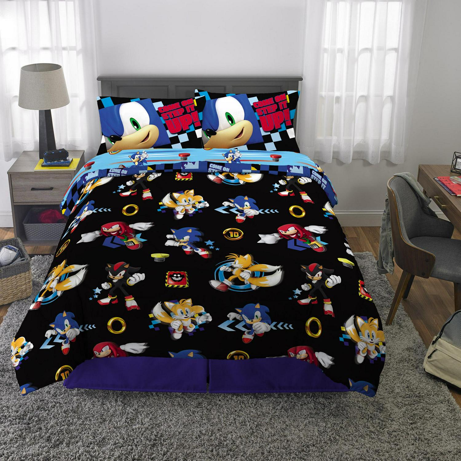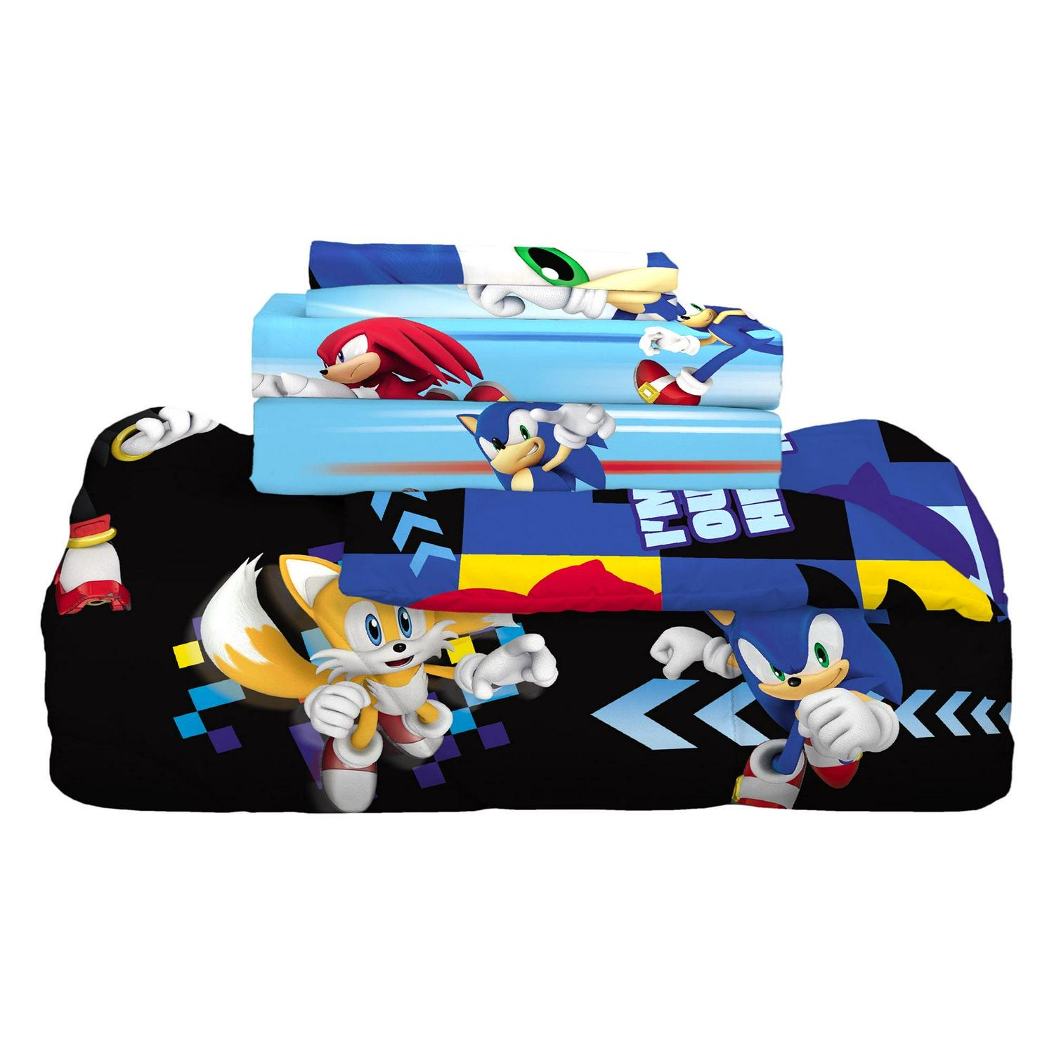 Give your child s bedroom a supersonic makeover with this exciting Sonic the Hedgehog bed-in-a-bag bundle set. Bold colors and an action-packed design bring the fun and friendly adventures of the iconic Sega superstar to this soft and stylish set. This high-quality polyester microfiber bedding set includes a comforter, fitted sheet, flat sheet, and pillowcase(s). One side of the reversible comforter features lively Sonic character imagery on a black backdrop while a colorful all-over pattern of character silhouettes and playful sayings pop on the blue background of the reverse side. The cozy flat sheet, top sheet and pillowcase add to the look with coordinating character artwork in complementary vivid colors. Help ensure your little gamer is rested up for racing each morning by giving him a good night s sleep in this fun and functional bedding set.