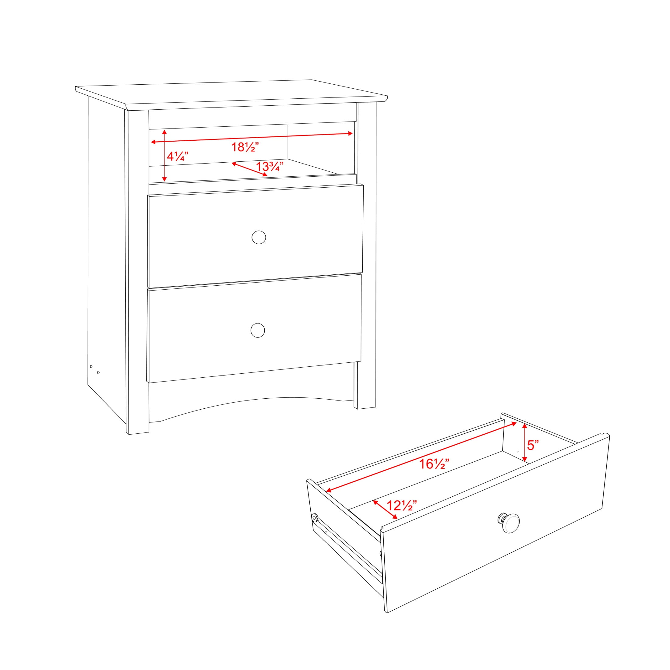 Prepac Sonoma Traditional Tall 2-Drawer Bedroom Nightstand, Washed Black: Detailed with profiled top edges, an arched kickplate and solid metal knobs with matte finish Drawers run smoothly on metal glides with built-in safety stops Sturdy, solid pine wood drawer sides Finished in soft, washed black laminate Unique construction eliminates visible screw caps and decreases assembly time Assembled dimensions: 23.25 in. W x 28 in. H x 16 in. D Internal Dimensions: 18.5 in. W x 4.25 in. H x 13.75 in. D (open shelf) 16.5 in. W x 5 in. H x 12.5 in. D (drawer) Manufactured in North America and meets all safety standards Constructed from non-toxic, laminated composite woods with a sturdy MDF backer Weight Capacity: Per Drawer: 8 lbs; On Top: 25 lbs