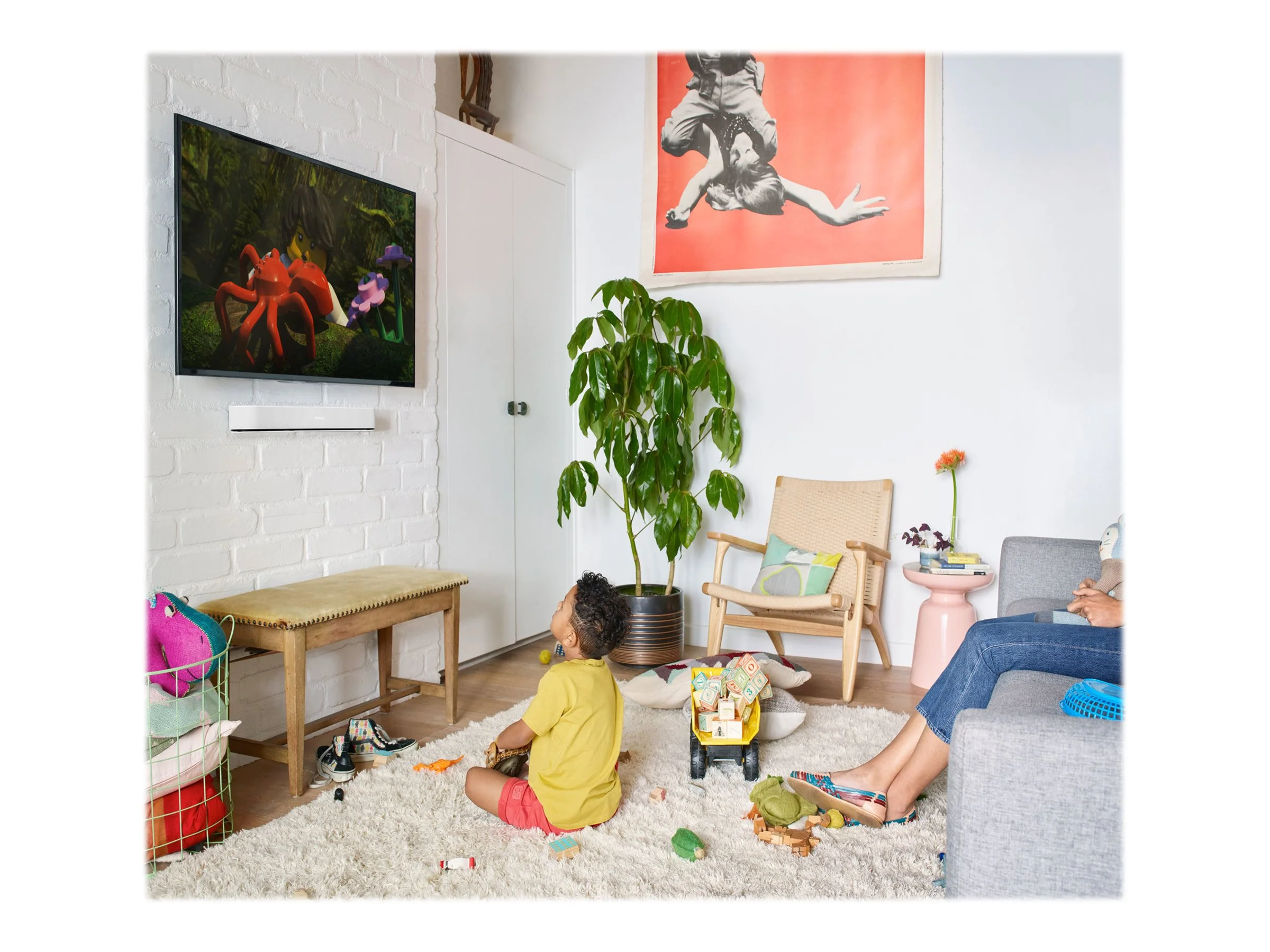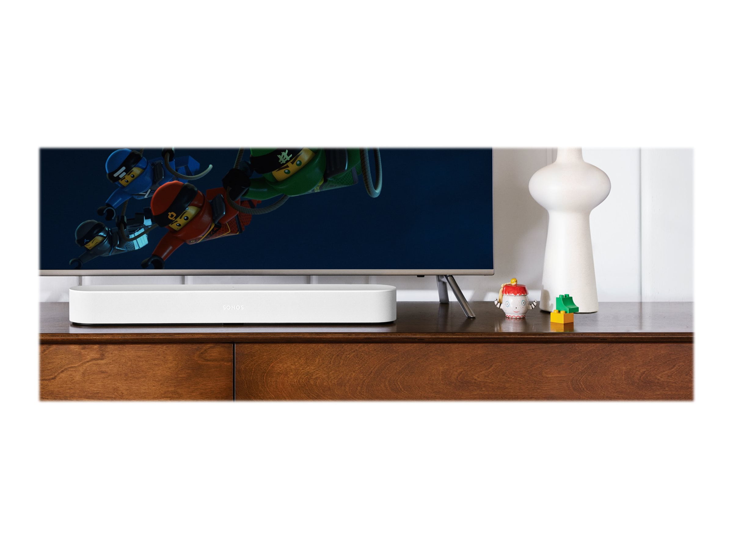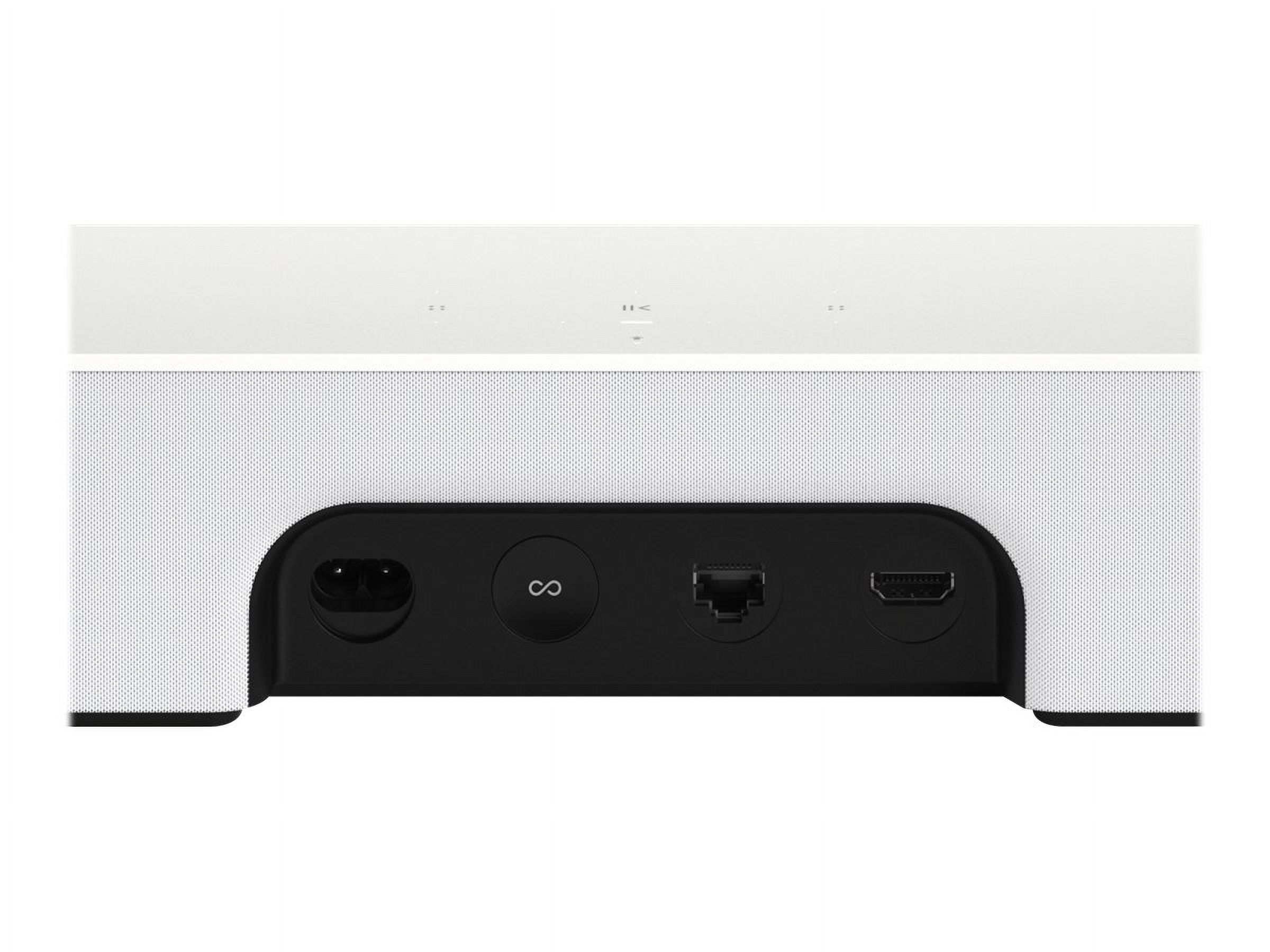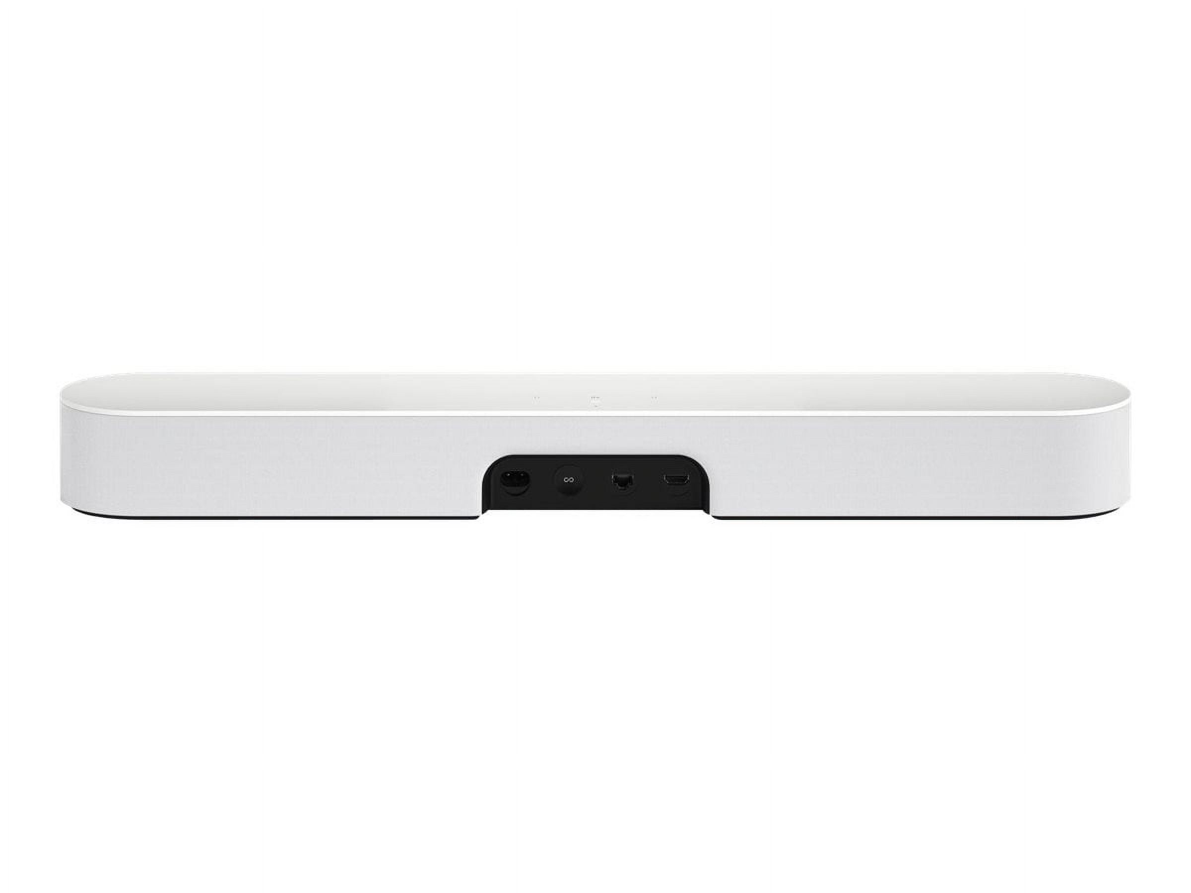 Plug Sonos Beam into power and then connect it to your TV using the HDMI cord. That’s it. Forget the tangled mess of traditional home theater systems.Balanced SoundFour elliptical full-range woofers and one tweeter harmonize low and high frequencies. Three passive radiators intensify and deepen the bass eliminating the need for an accompanying subwoofer.Listen in Any Room or Every RoomPlay a movie in the living room a podcast in the kitchen or the same song everywhere when you set up multiple speakers.Privacy When You Want ItWhen the microphone LED is on is ready for a voice command. When the light is off the microphone is off.What’s in the Box:Beam Compact Smart SoundbarPower cordHDMI cableOptical audio adapterFlat Ethernet cableQuick start guideWarranty information Specifications Dimensions: 25.62″ x 3.94″ x 2.7″ Amazon voice control Wi-Fi AirPlay