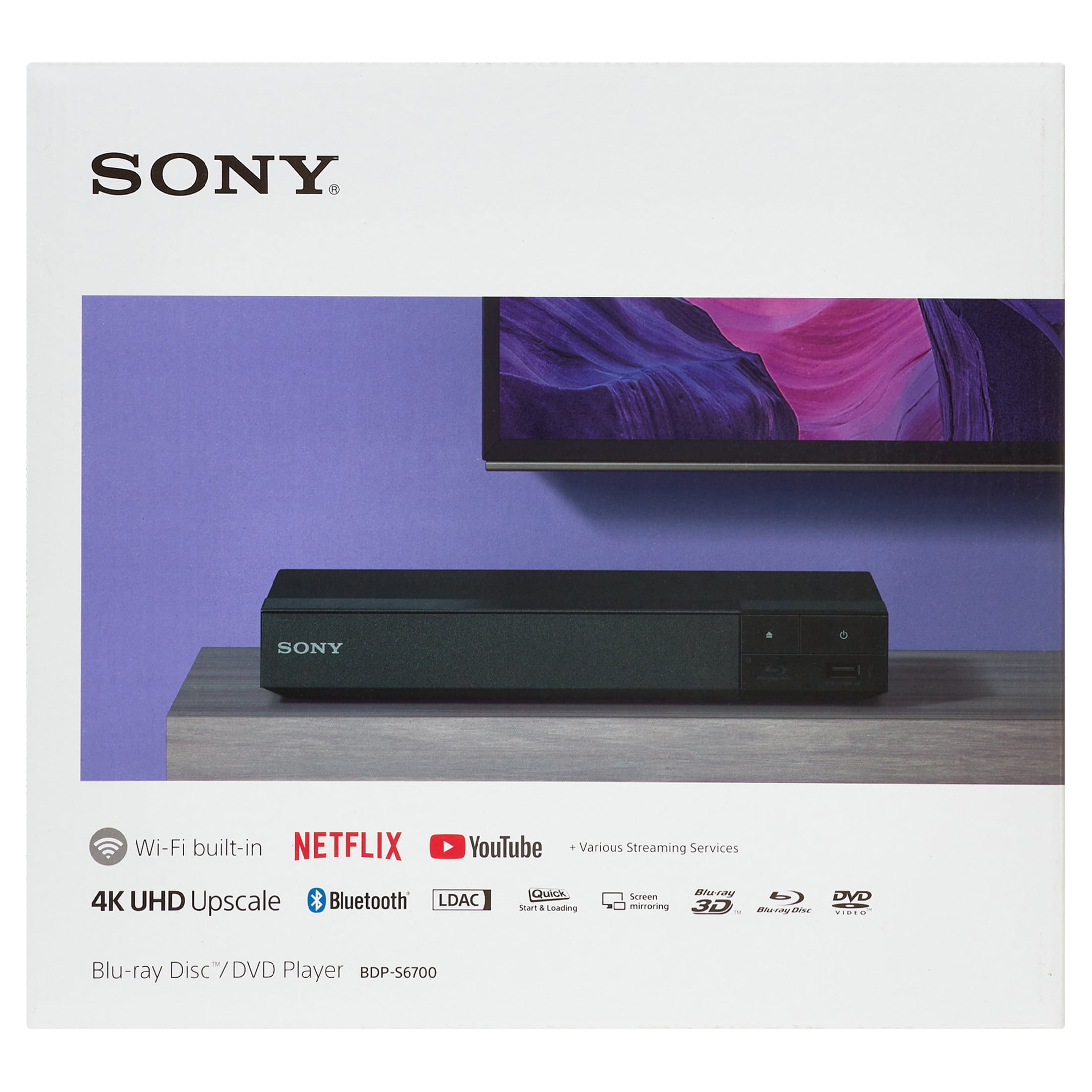 Bring the theater home: Get the best seat in the house while enjoying movies and content from the comfort of your family room Playback of HD Blu-ray discs and DVDs Smart Functionality: With fast, stable, built-in Wi-Fi, you can wirelessly access your favorite streaming apps and services including Netflix, YouTube, Amazon Prime Video & more Inputs/Outputs: 1 HDMI, 1 USB, 1 Coaxial, 1 Ethernet. Features built-in wifi 4K Upscaling: Get the most out of your 4K Ultra HD TV by upscaling the quality of your Blu-ray movies to near 4K quality. 4K Ultra HD discs are not supported The upscaling chip also improves the quality of online content, and upconverts DVD’s to near HD quality for an improved viewing experience Sound: Experience HD sound with Dolby and DTS-Master Audio. Enjoy multi-room streaming capabilities with the SongPal Link Apps, and connect via Bluetooth to enjoy wireless listening Screen Mirroring: View your Android mobile devices’ content on your TV with Miracast screen mirroring technology Front USB Port: Enjoy your videos, photos and digital music with USB connectivity. DLNA Home sharing: DLNA allows you to share multimedia content across all supported devices in your home